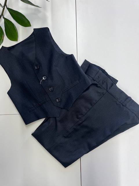 Kvalitný chlapčenský komplet pozostáva z vestičky na zapínanie s podšívou a nohavíc. Nohavice majú regulovateľný pás.