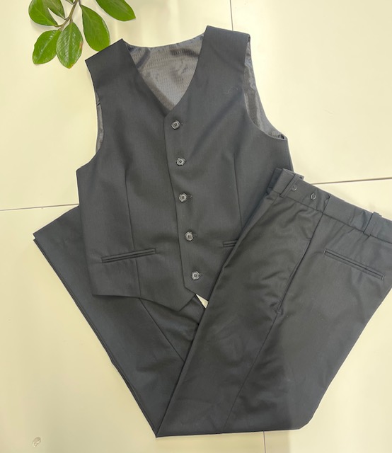 Kvalitný chlapčenský komplet pozostáva zo saka s podšívkou, z vestičky na zapínanie s podšívou a nohavíc. Nohavice majú regulovateľný pás.