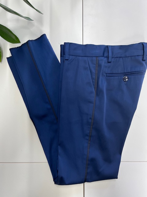 - nohavice tmavomodré, pozdĺž nohavíc jemný čierny saténový pásik, regulovateľný pás, možnosť podšitia podľa potreby