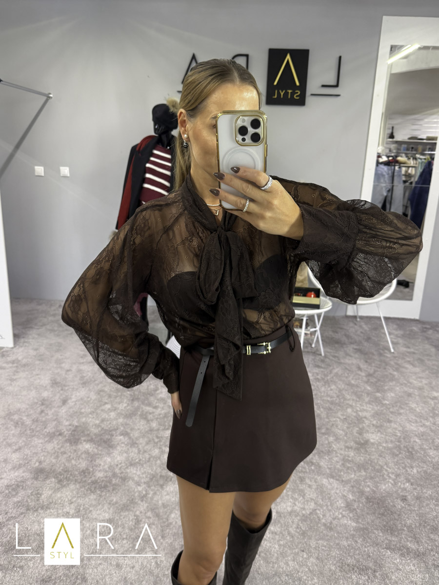 Dámska čipkovaná blúzka v hnedej farbe, s viazaním pod krkom. Zapínanie na gombíky, na konci rukáva patent a taktiež gombíky. Modelka má výšku 165 cm.