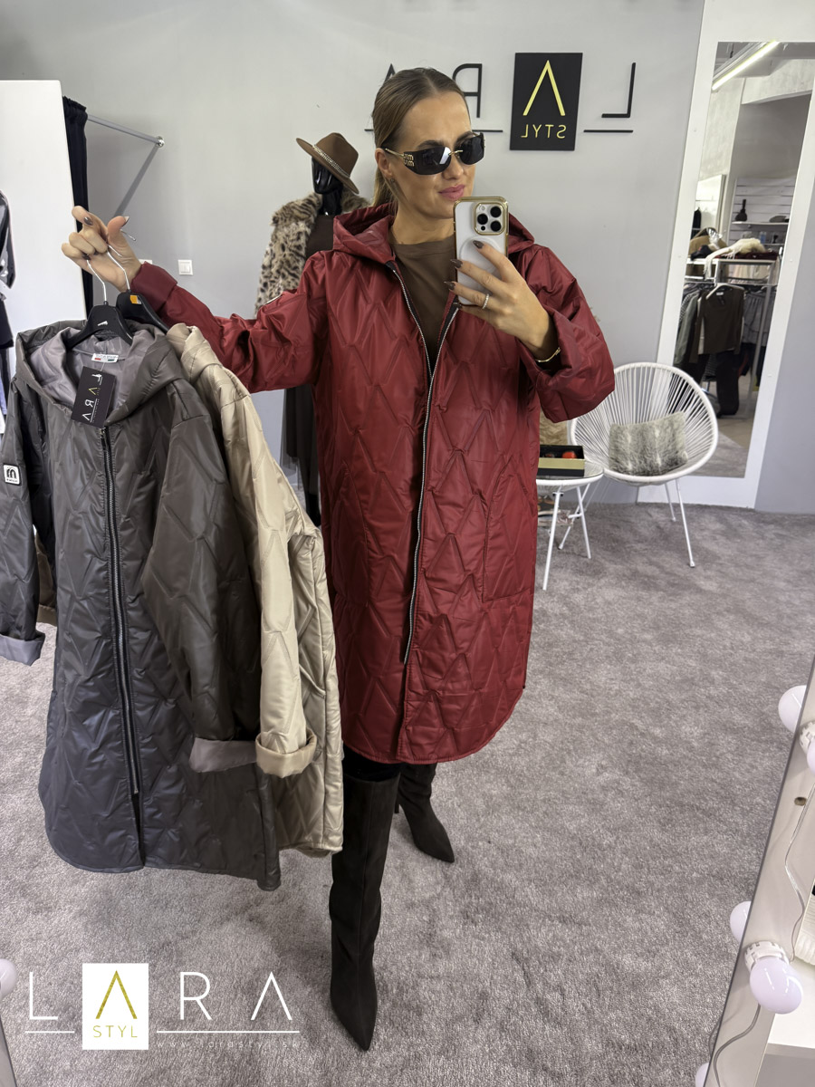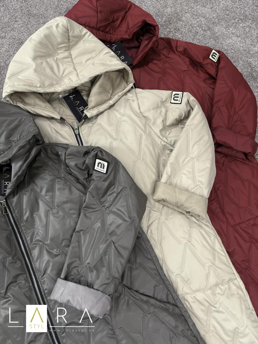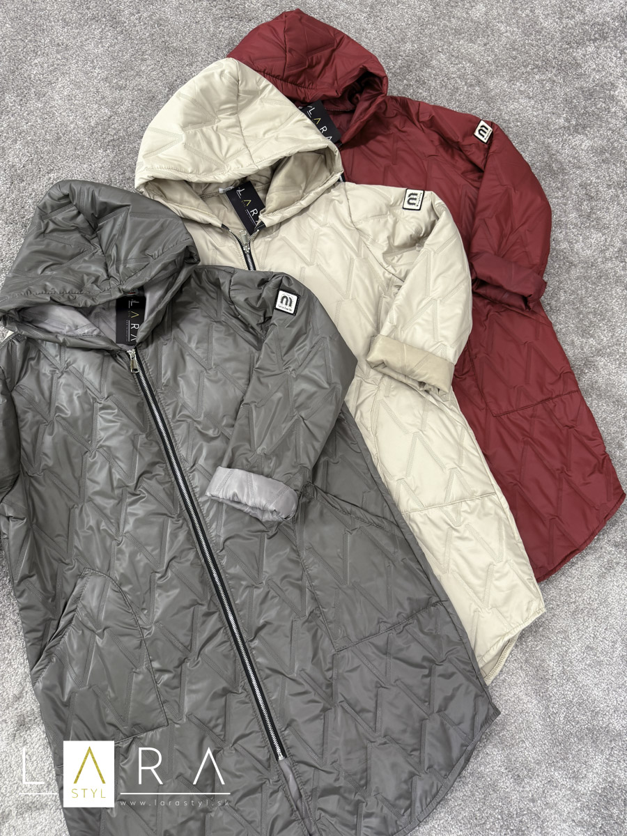 Dámska prešívaná bunda s kapucňou je z ľahučkého materiálu, zapínanie na zips, v predu vrecká, oblúkovité zakončenie v spodnej časti. Bunda je oversize strihu, čiže sadne v pohode aj do L. Modelka má výšku 165 cm.