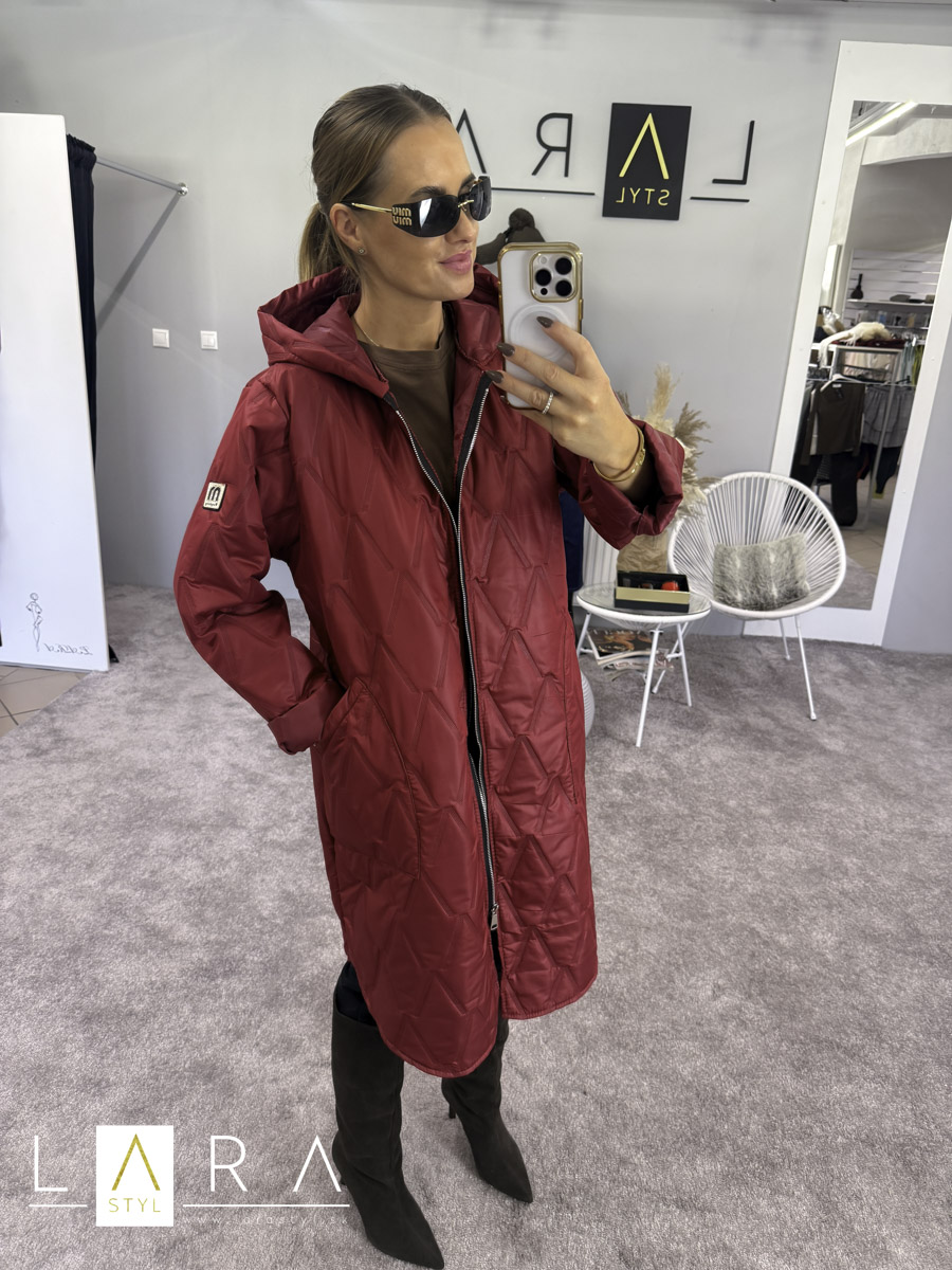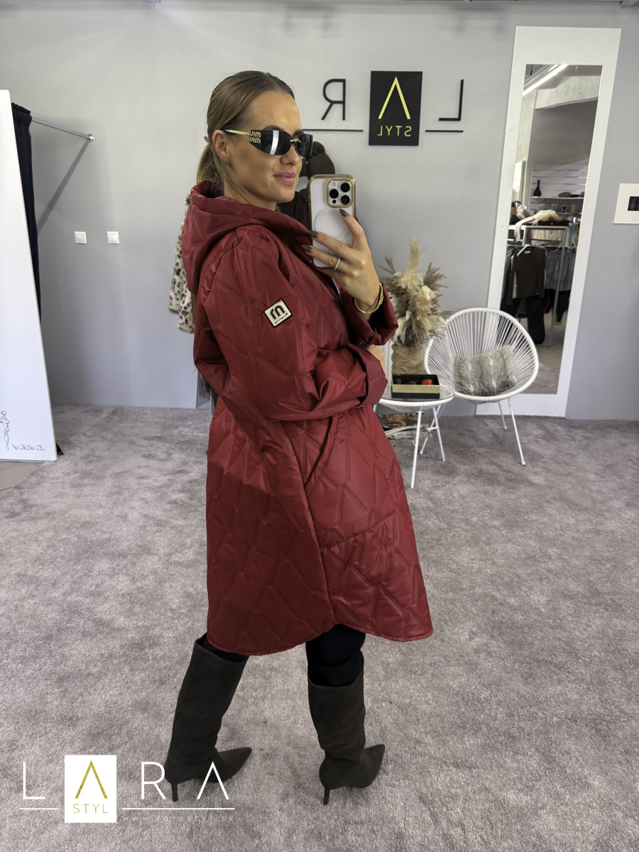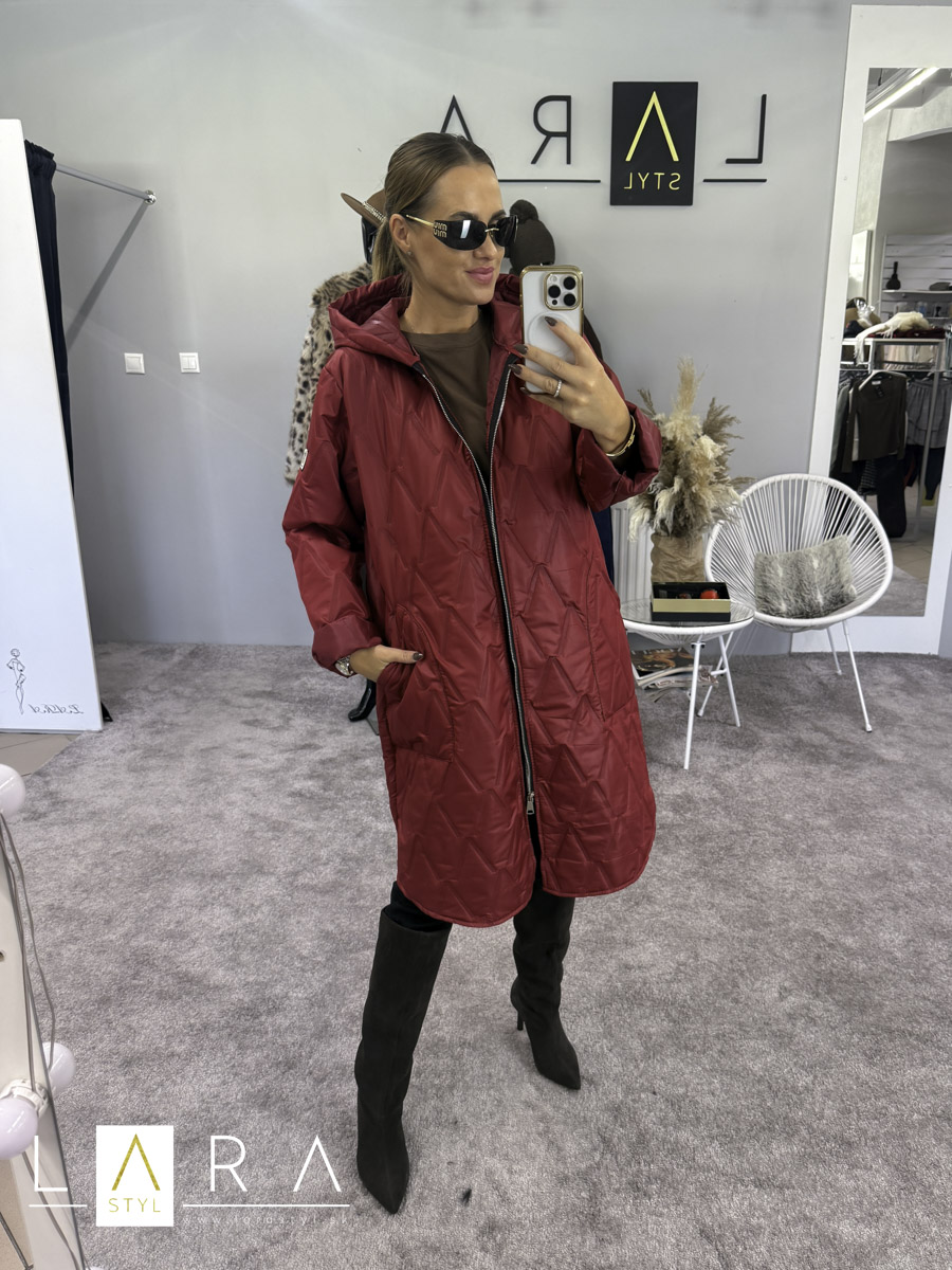 Dámska prešívaná bunda s kapucňou je z ľahučkého materiálu, zapínanie na zips, v predu vrecká, oblúkovité zakončenie v spodnej časti. Bunda je oversize strihu, čiže sadne v pohode aj do L. Modelka má výšku 165 cm.