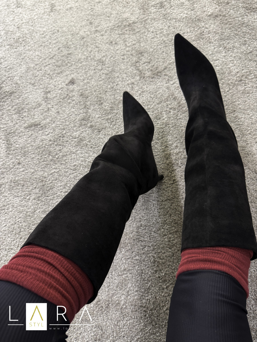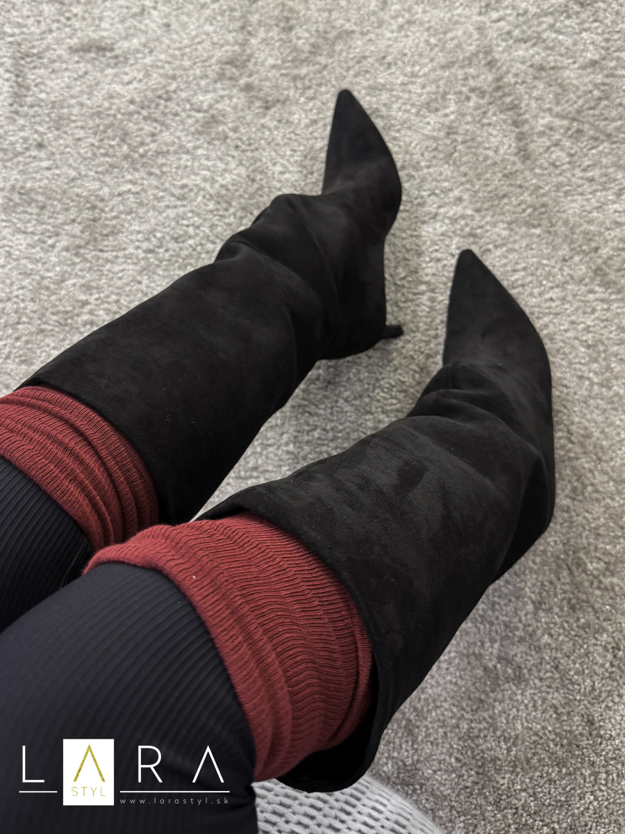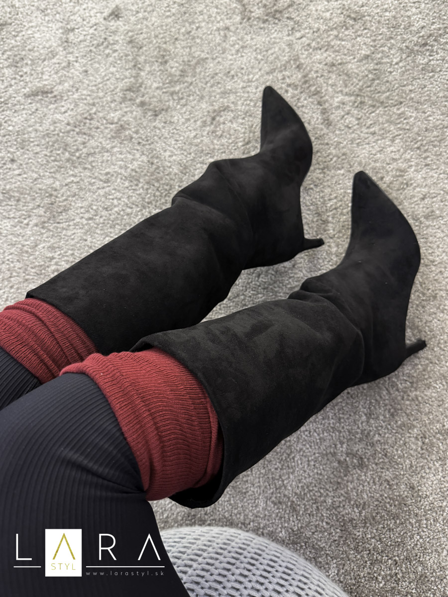 Dámske čižmy, čierne, z brúsenej kože. Mierny opätoček. Bez zipsu.
