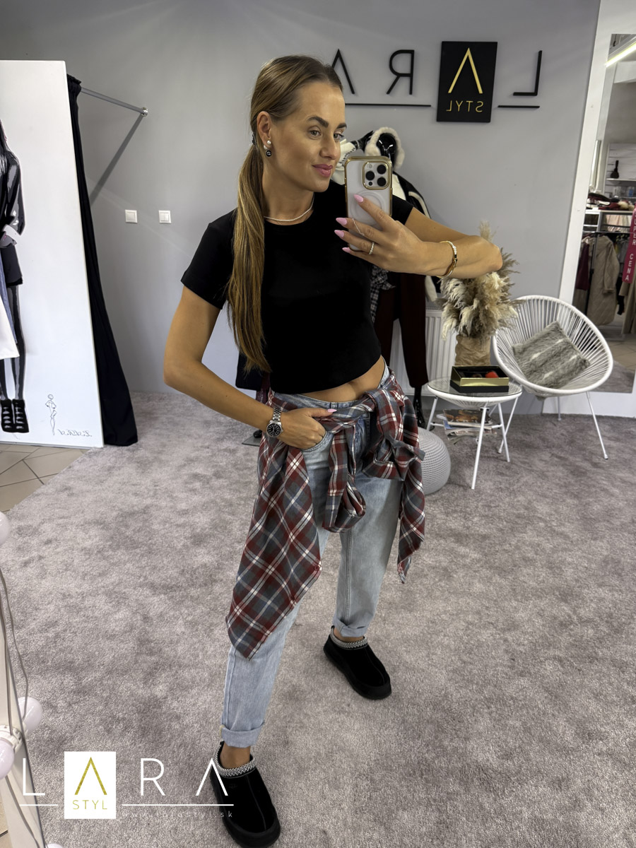 Dámsky crop top čiernej farby. Jemne vrúbkovaný, elastický materiál. Modelka má výšku 165 cm.