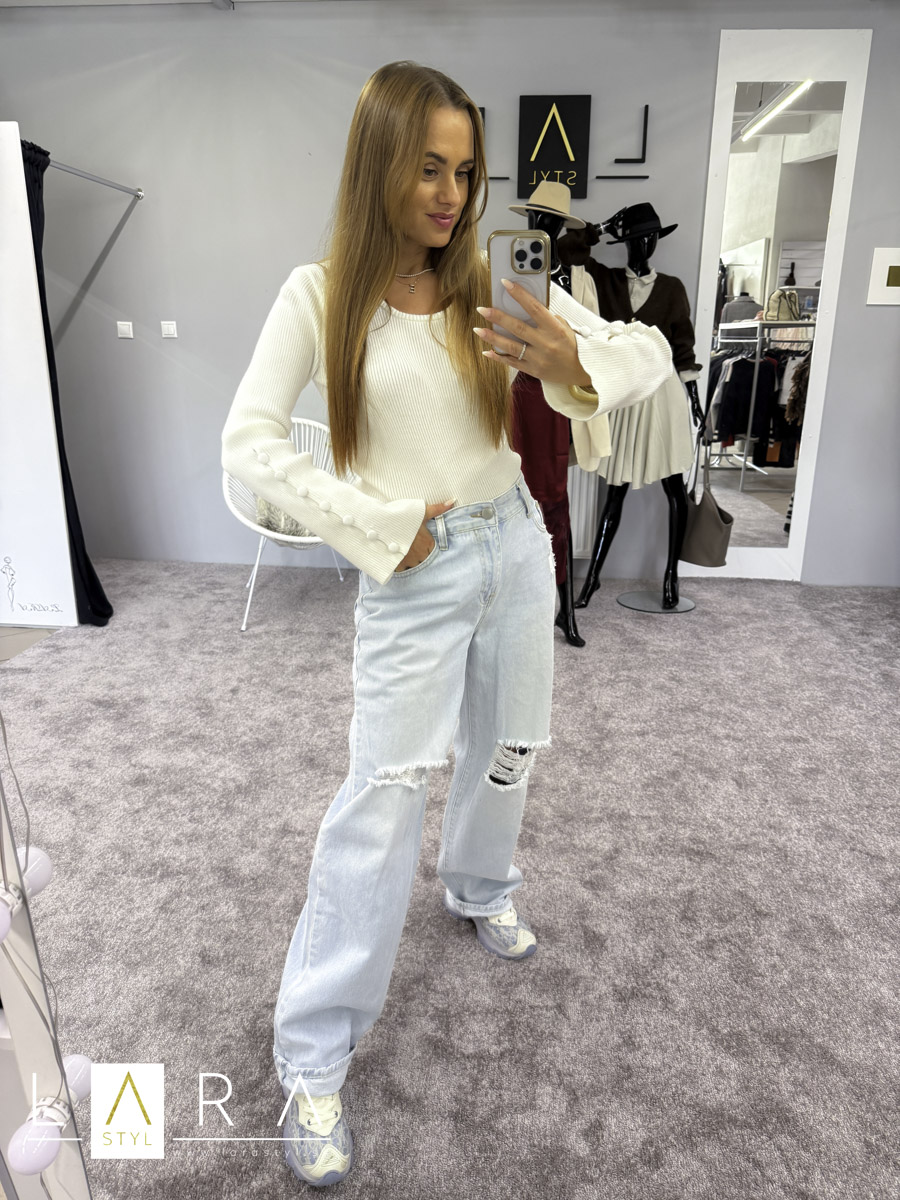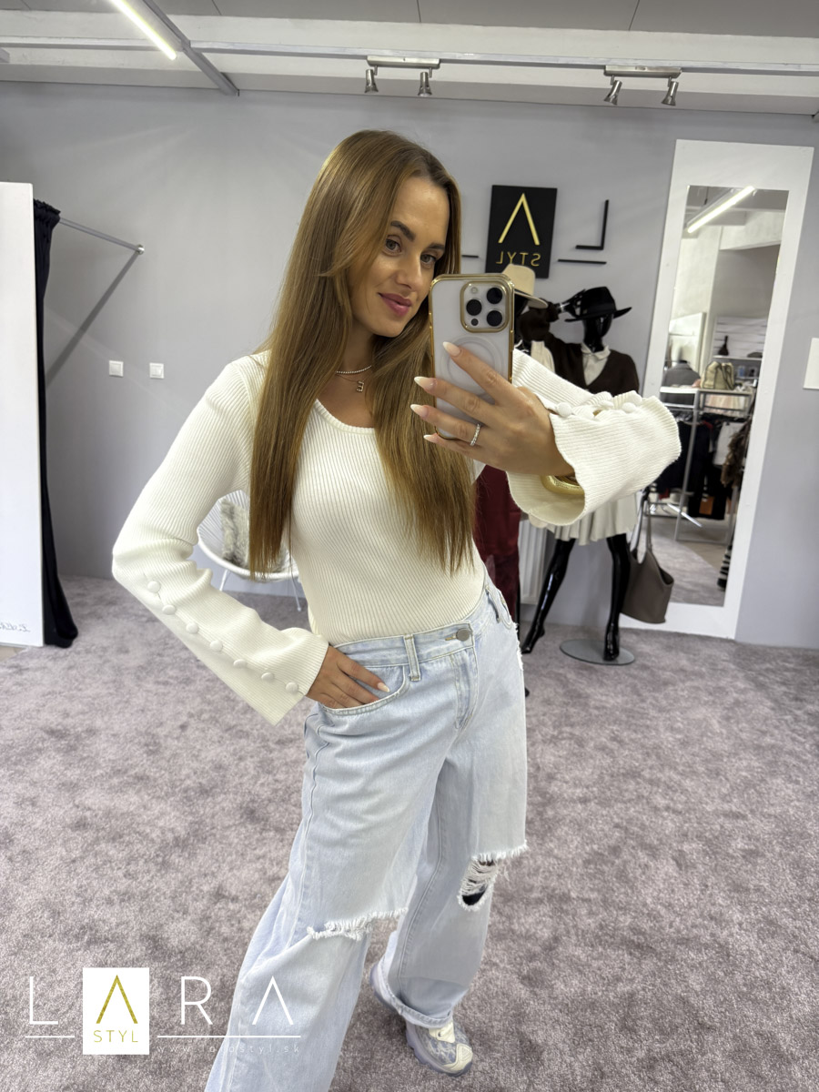 Štýlový dámsky pulóver s jednoduchým vzorom, rozšírenými zvonovými rukávmi. Na rukáve od lakťa dole sú našité gombíky. Modelka má výšku 165 cm.