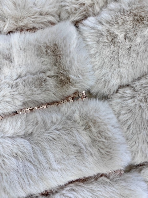 Dievčenská kožušinová vesta s podšívkou, prešívaná, medzi prešívanými pásmi je vsúnutý pásik s flitrami.