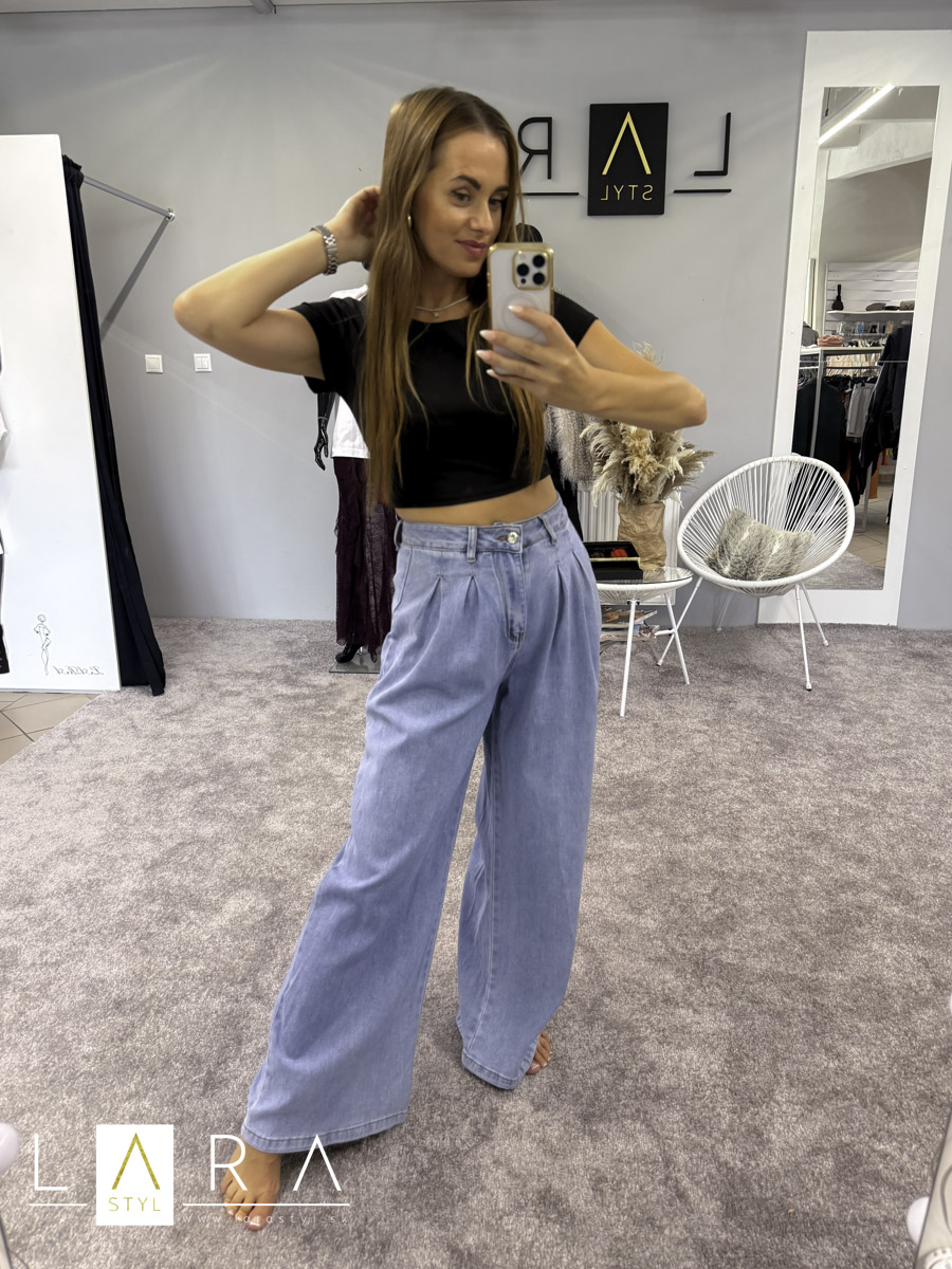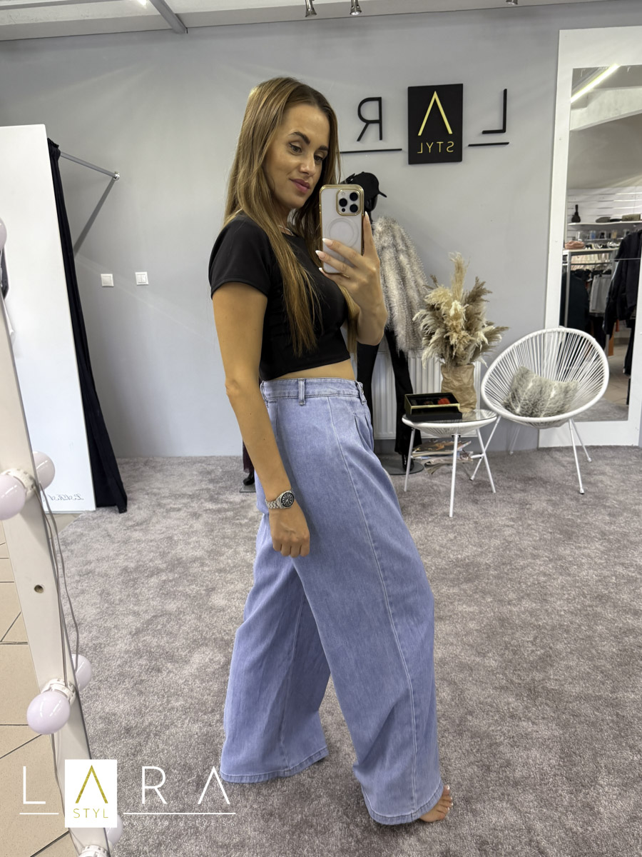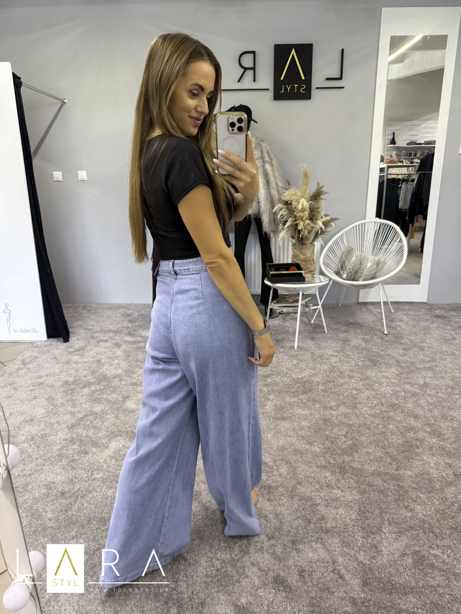 Rozšírené džínsy s vysokým pásom vyrobené z kvalitného materiálu. Džínsy sa skvelo prispôsobia postave. Zapínanie je na zips a gombík. Džínsy sú bez vrecák. Modelka má výšku 164 cm.