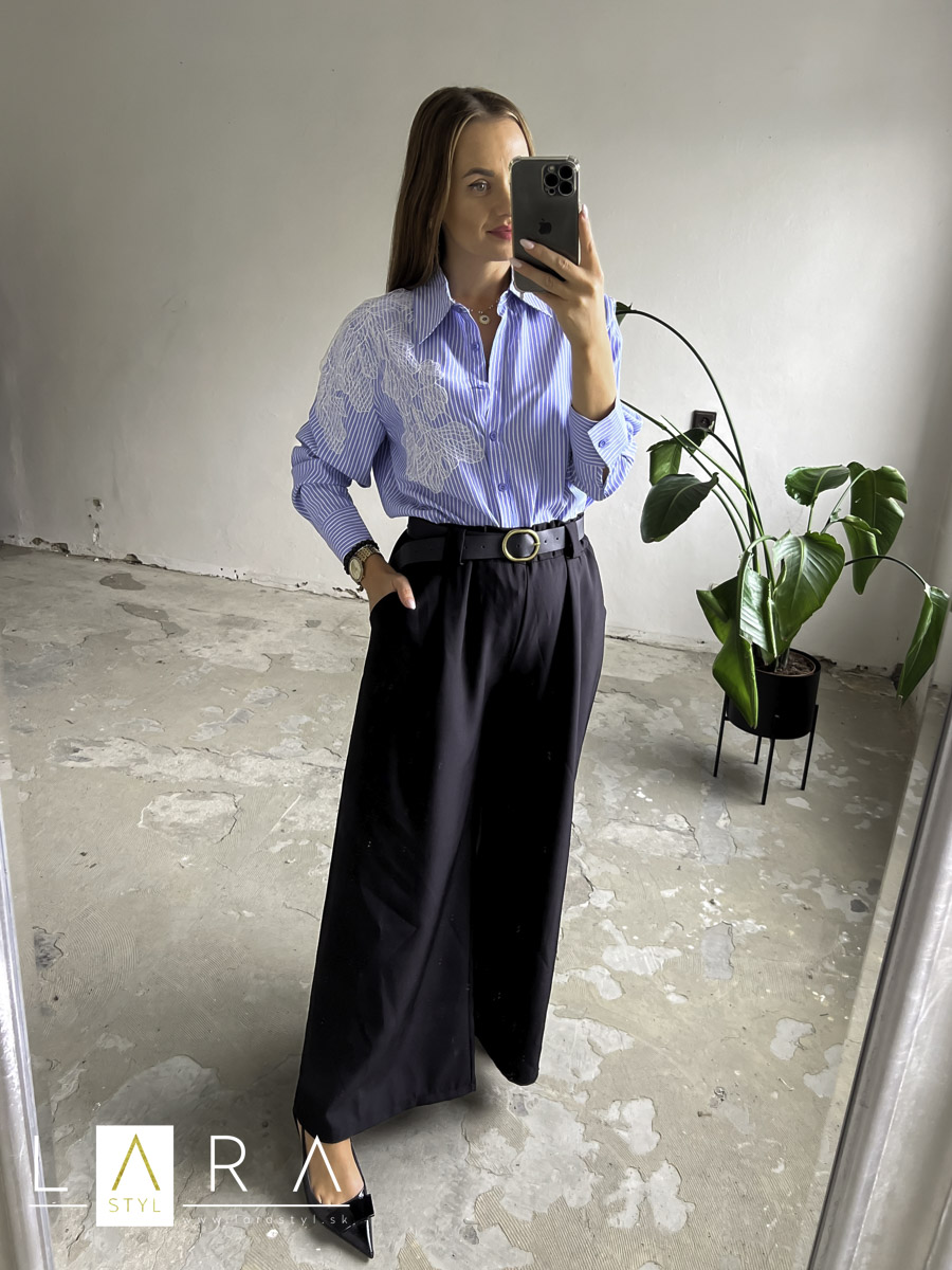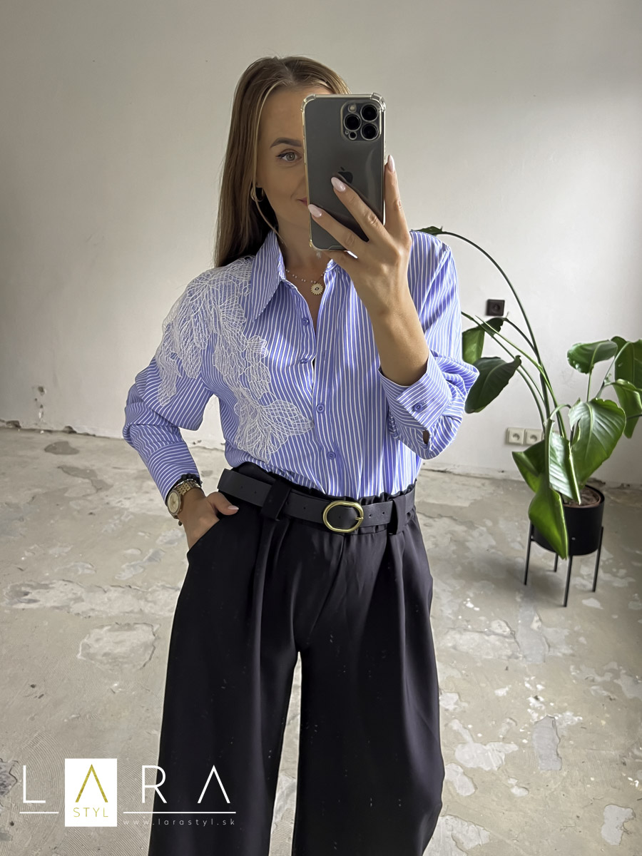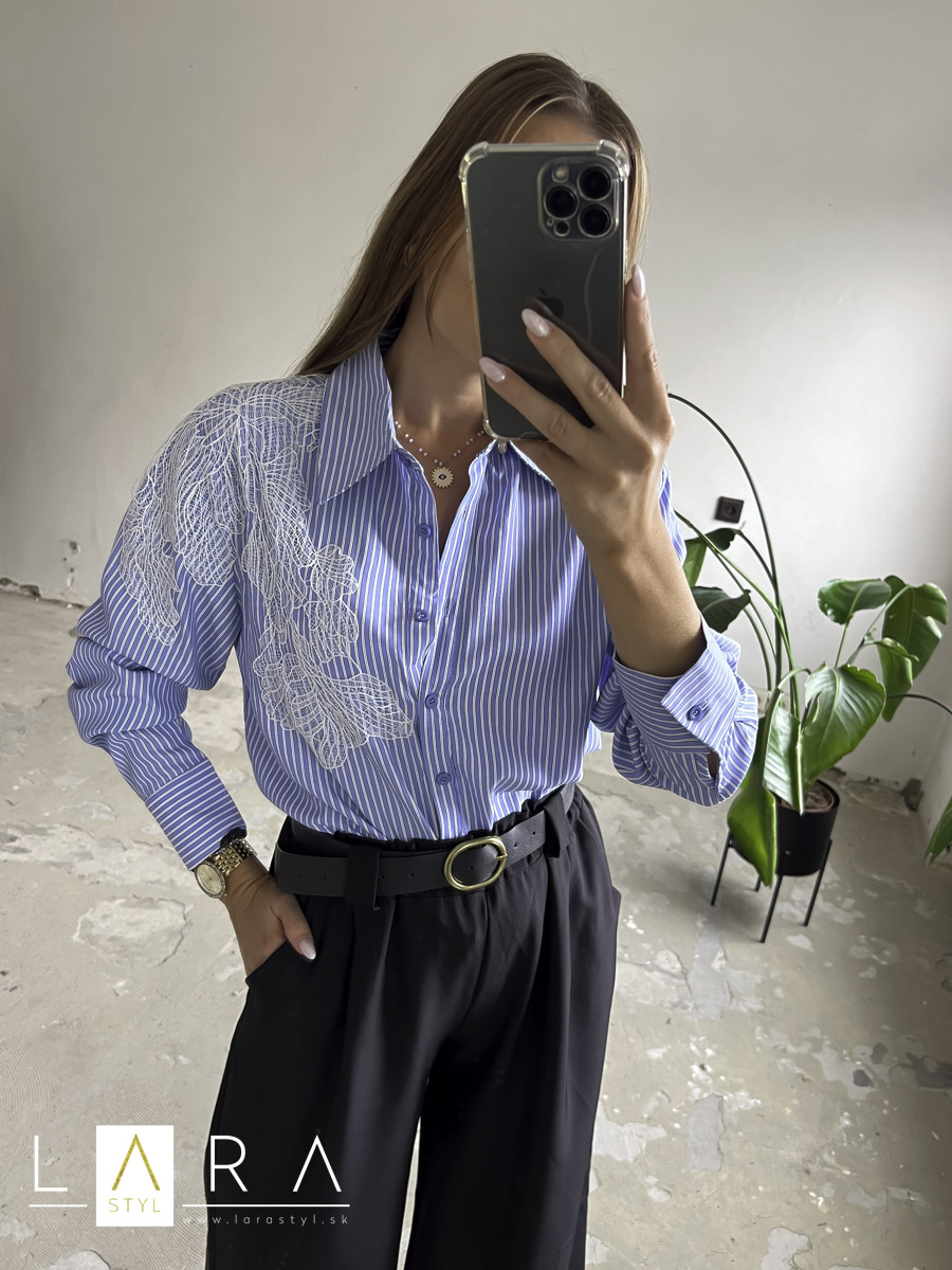 Košeľa s dlhým rukávom, zapínanie na gombíky. Košeľa má v prednej časti a cez jedno rameno prišitú jemnú vyšívanú aplikáciu. Košeľa je rovnejšieho strihu, skôr mierne do áčka. Má jemný biely pásik. Modelka má výšku 164 cm.
