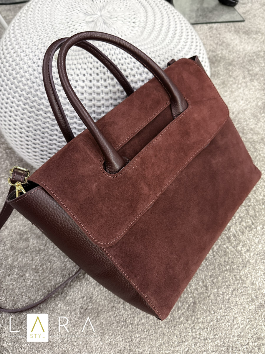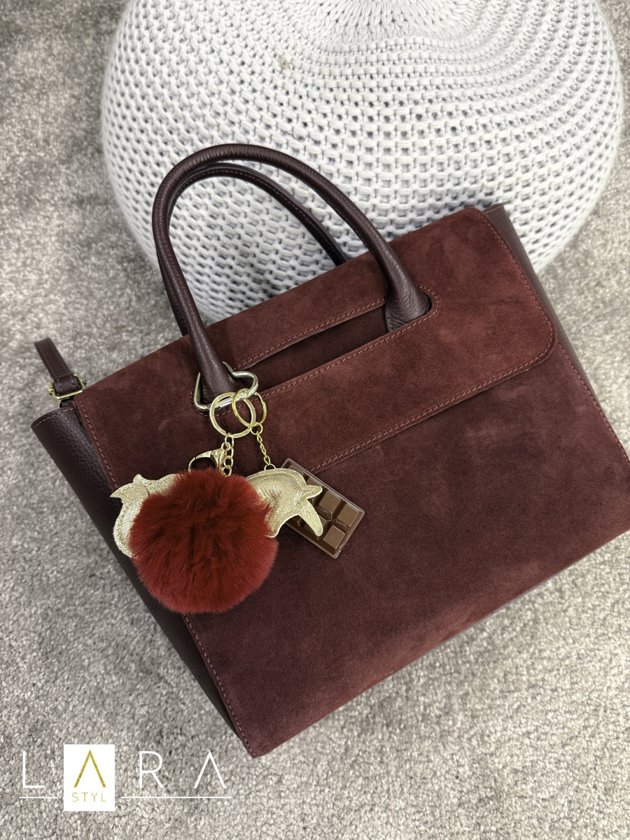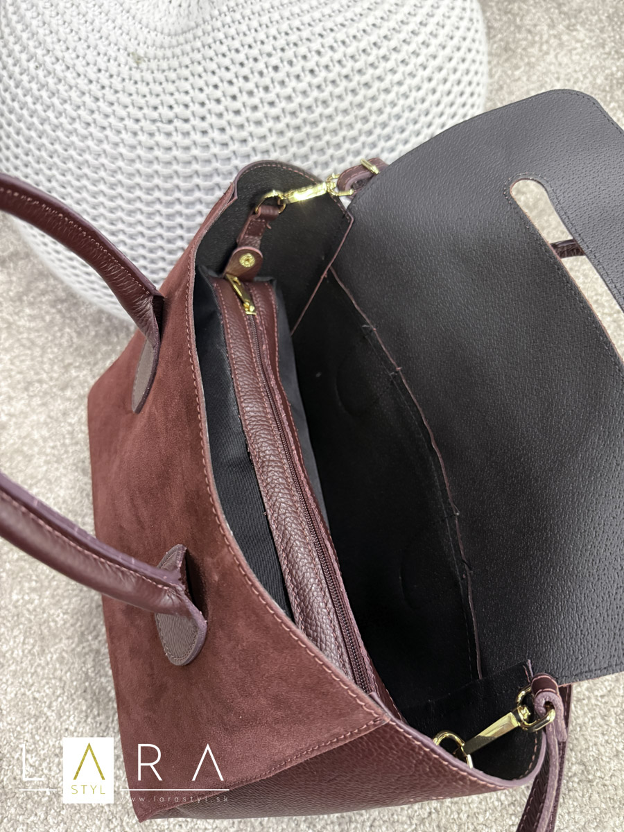 Kožená kabelka burgundy, kabelka má vo vnútri ešte jedno vrecko so zapínaním na zips, plus prídavné ramienko.Vrchné zapínanie na kabelke je formou preloženia. Prívesok nie je súčasťou.