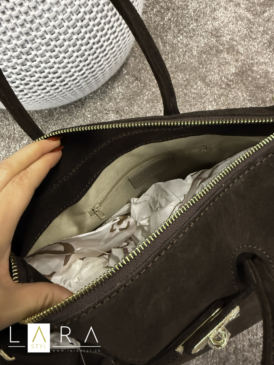 Kožená kabelka tmavohnedá, kabelka má vo vnútri bočné vrecko na zips a dve malé božné priehradky, zapínanie na zips. Nemá prídávné ramienko.