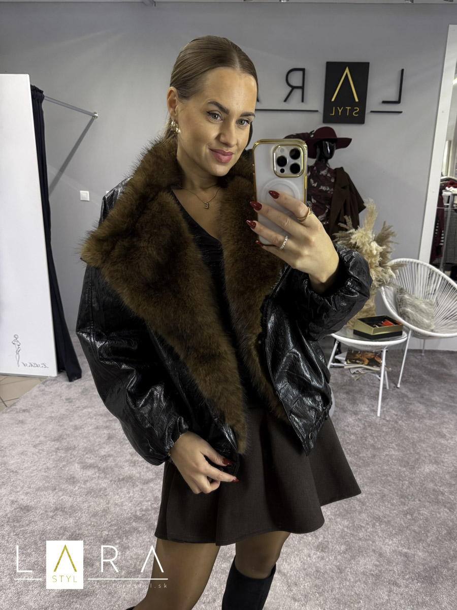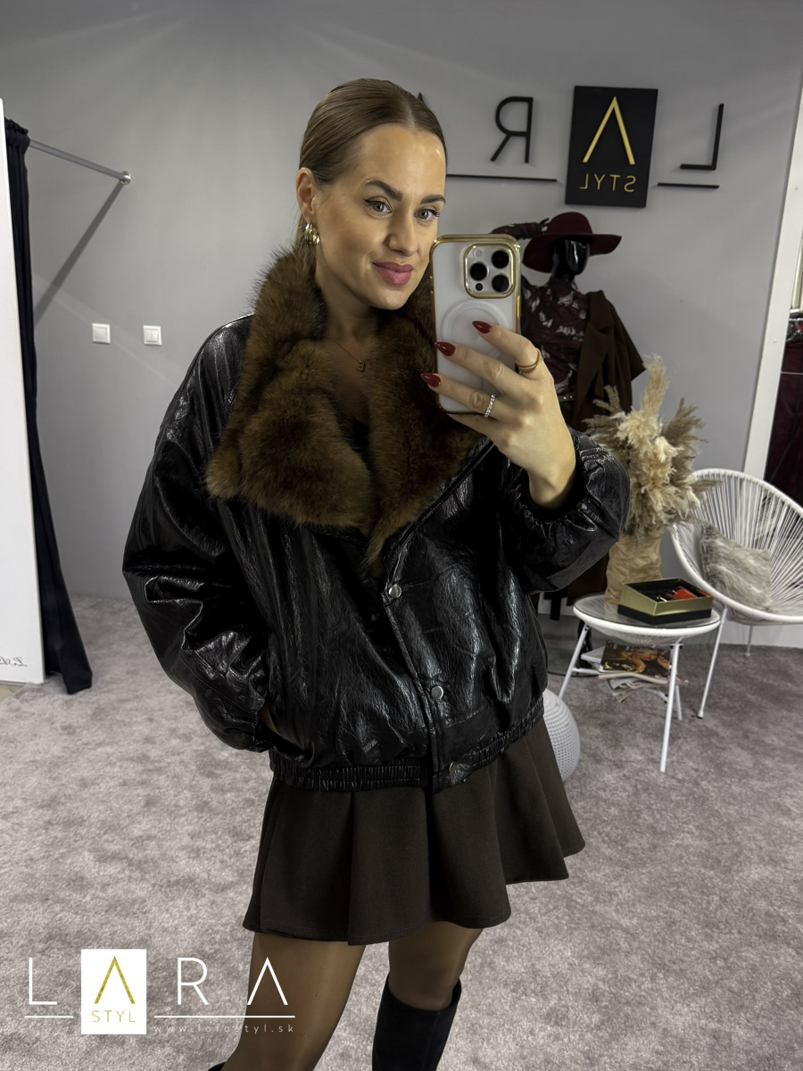 Čierna koženková bombera s kožušinovým golierom, zapíanie na zips plus kovové cvoky. Bombera je mierne OVERSIZE strihu. V spodnej časti je gumička. Modelka má výšku 165 cm.