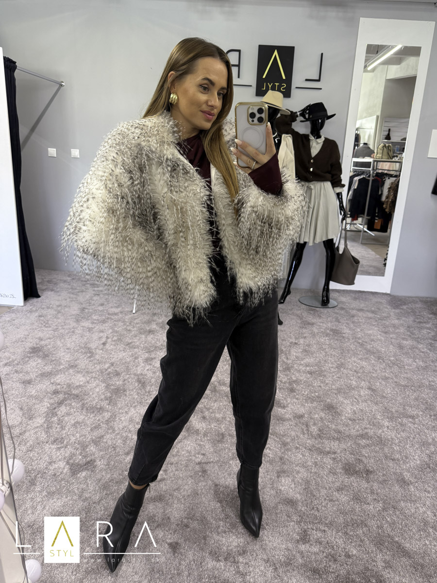 Dámska kožušinová bundička, mierneho oversize strihu, s dvoma vreckami, zapínanie na háčiky. Modelka má výšku 165 cm.