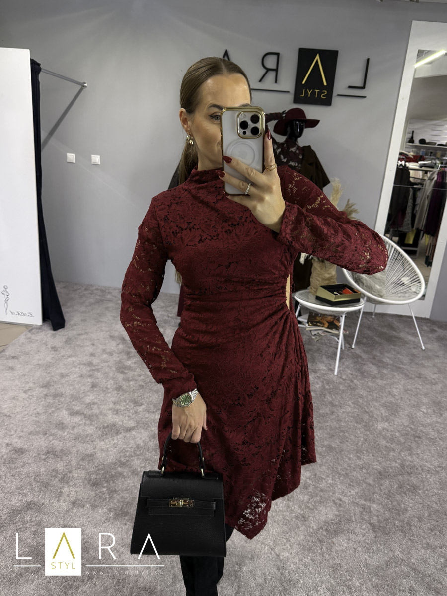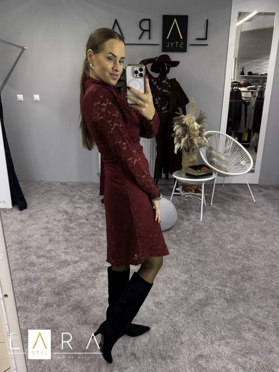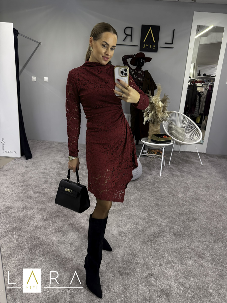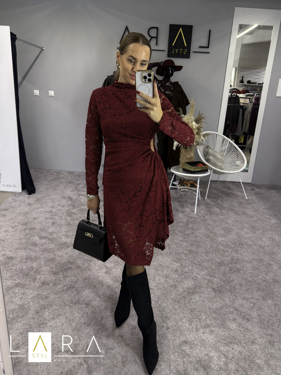 Krajkové šaty so stojačikom, sú z príjemného elastického materiálu, dlhý rukáv, asimetrické zakončenie, na jednej strane sú jemne nariasené do strany s menším okrúhlym otovorom na boku. Šaty majú podšívku. Modelka má výšku 165 cm.