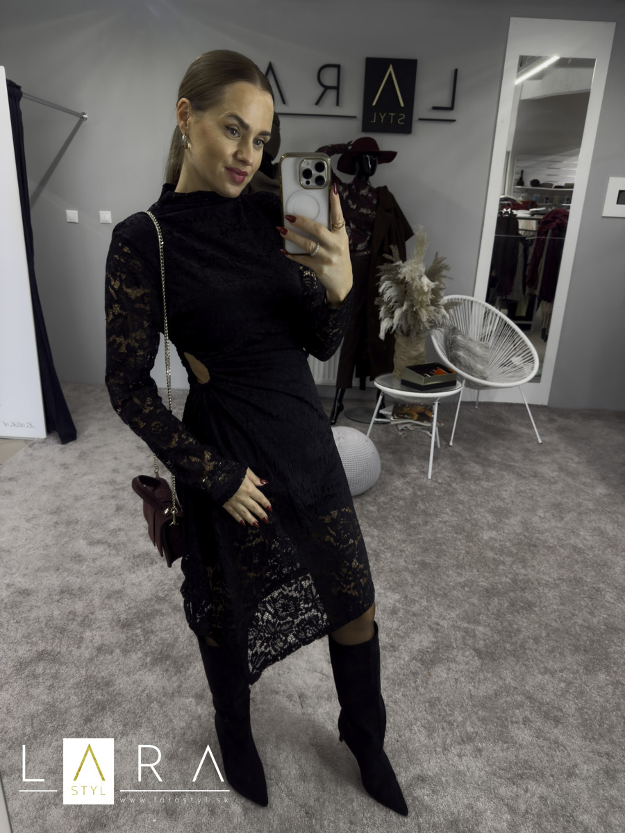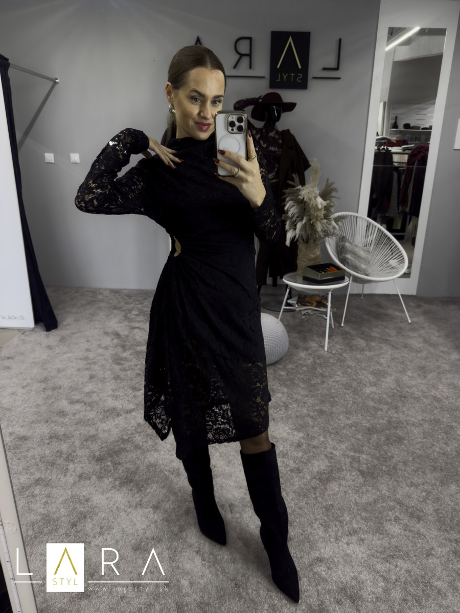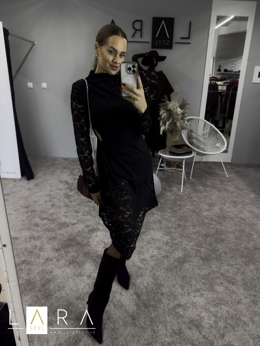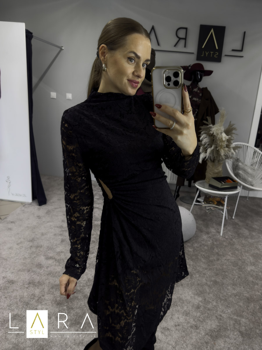 Krajkové šaty so stojačikom, sú z príjemného elastického materiálu, dlhý rukáv, asimetrické zakončenie, na jednej strane sú jemne nariasené do strany s menším okrúhlym otovorom na boku. Šaty majú podšívku. Modelka má výšku 165 cm.