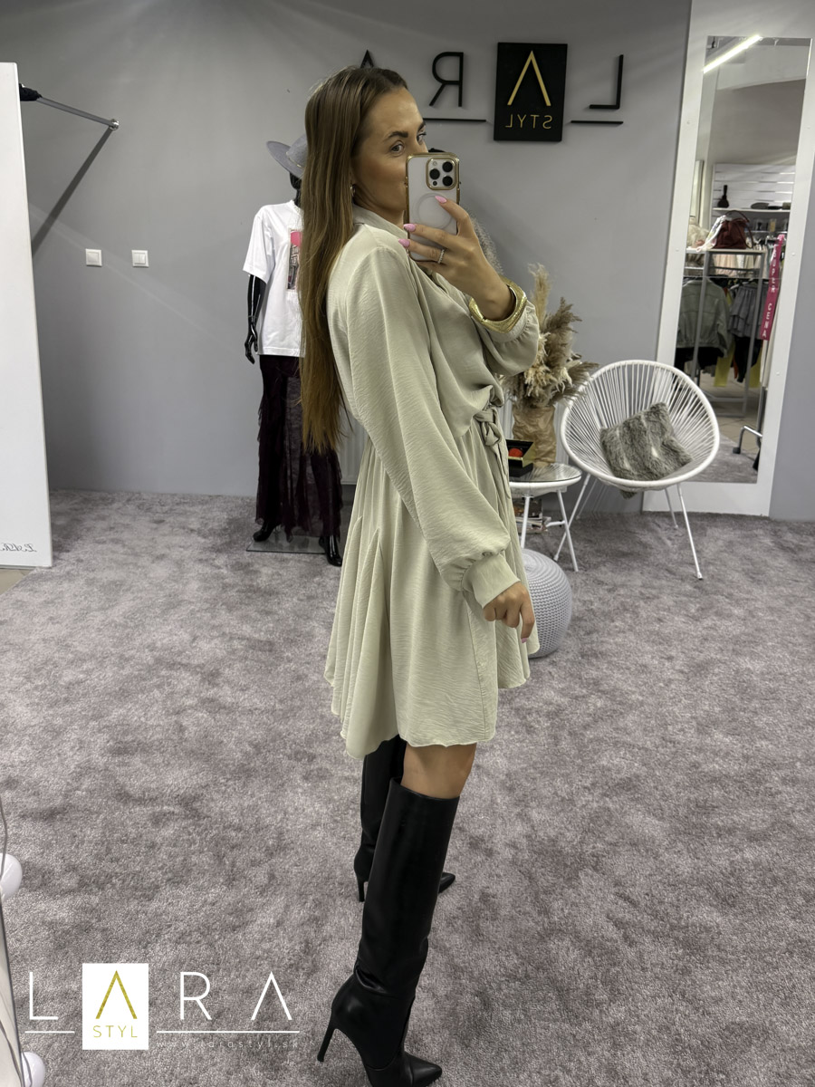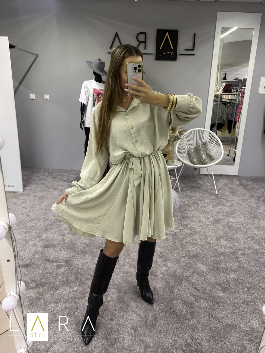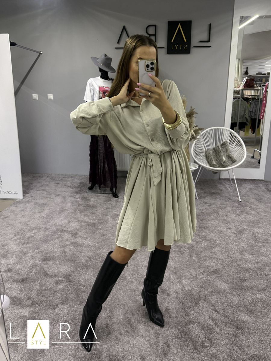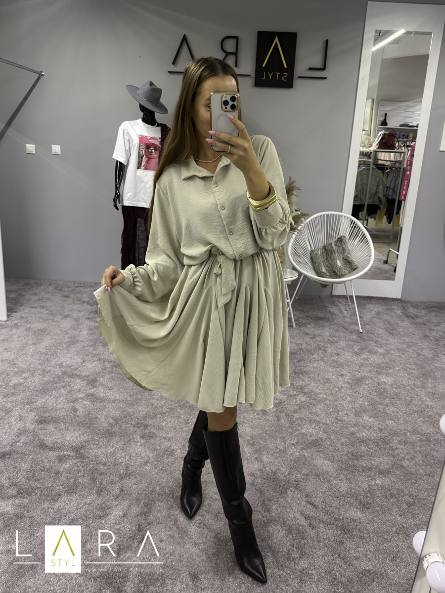 Krátke šaty mierneho OVERSIZE strihu s golieriom a so zapínaním na gombíky do pása. V páse gumička plus viazanie. Na konci rukáva patent plus zapinanie na gombíky. Šaty majú rozšírenú sukničku. Šaty sadnú až do veľkosti XL. Modelka má výšku 165 cm.