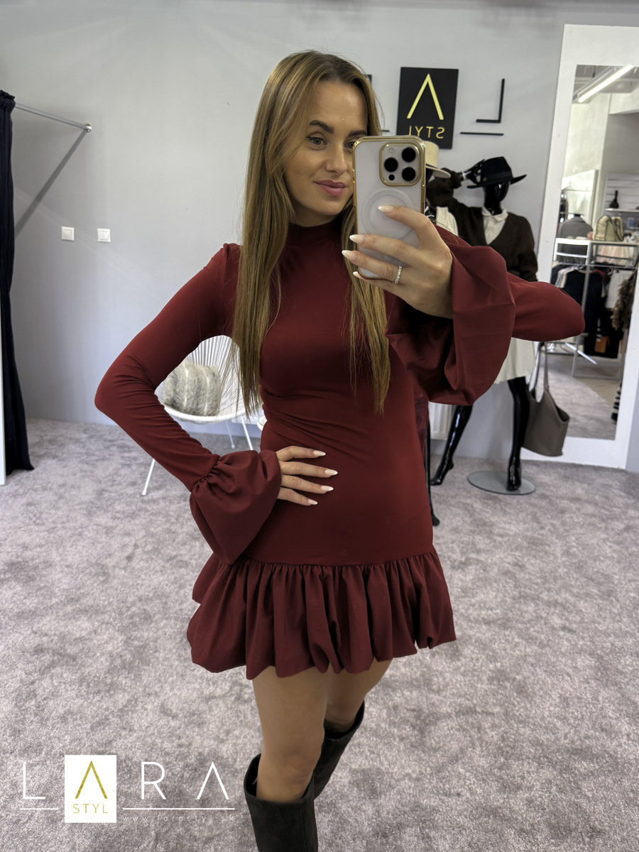 Mini šaty v nádhernej bordovej farbe, z jemne elastického materiálu, v spodnej časti a na konci rukáva riasenie. Modelka má výšku 165 cm.