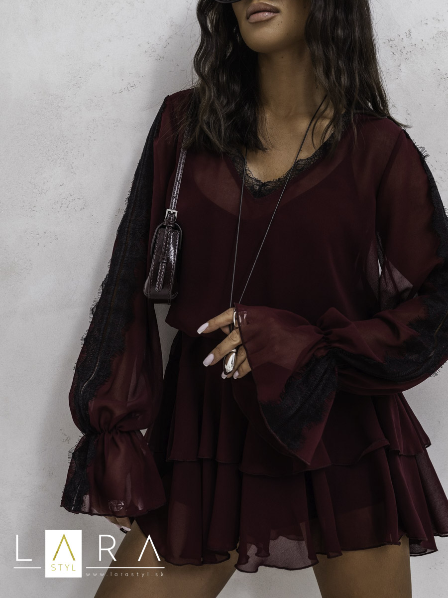 Mini šaty volnejšieho strihu, v spodnej časti volány, rukáv ztiahnutý gumičkou taktiež s volánom, výstrih v tvare V. Šaty sú vo výstrihu a pozdĺž rukáva doplnené o krajku. Šaty majú elastickú spodnicu. Modelka má výšku 165 cm.