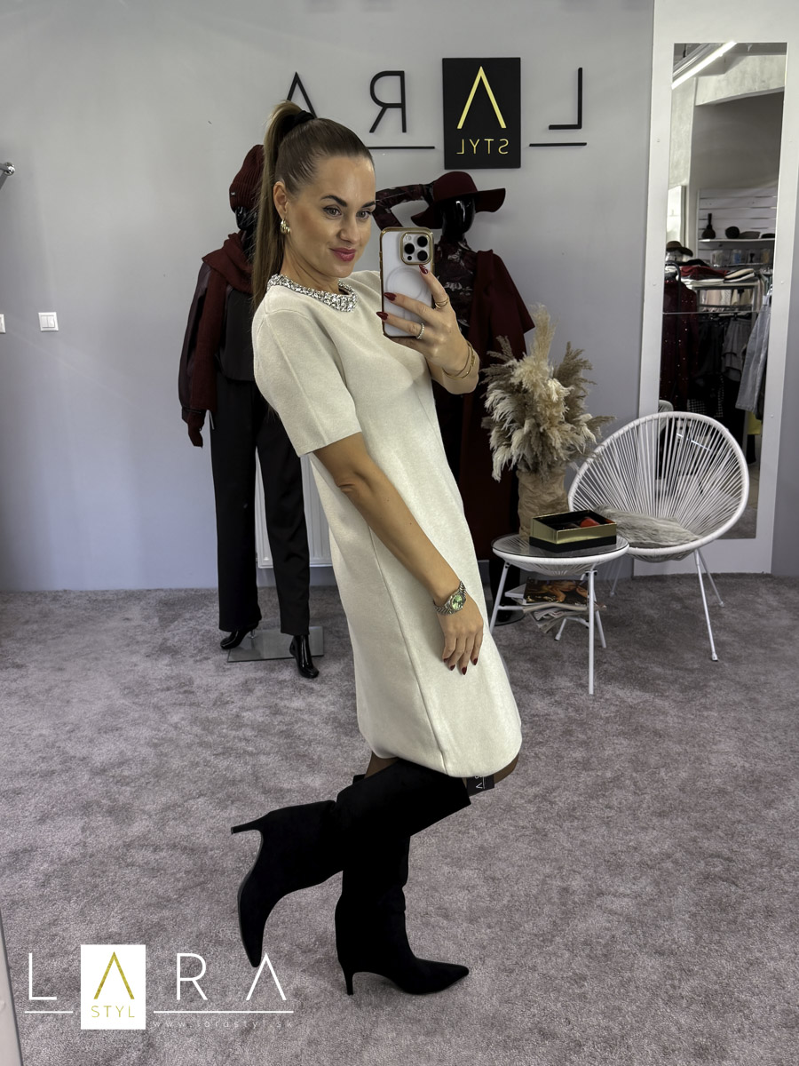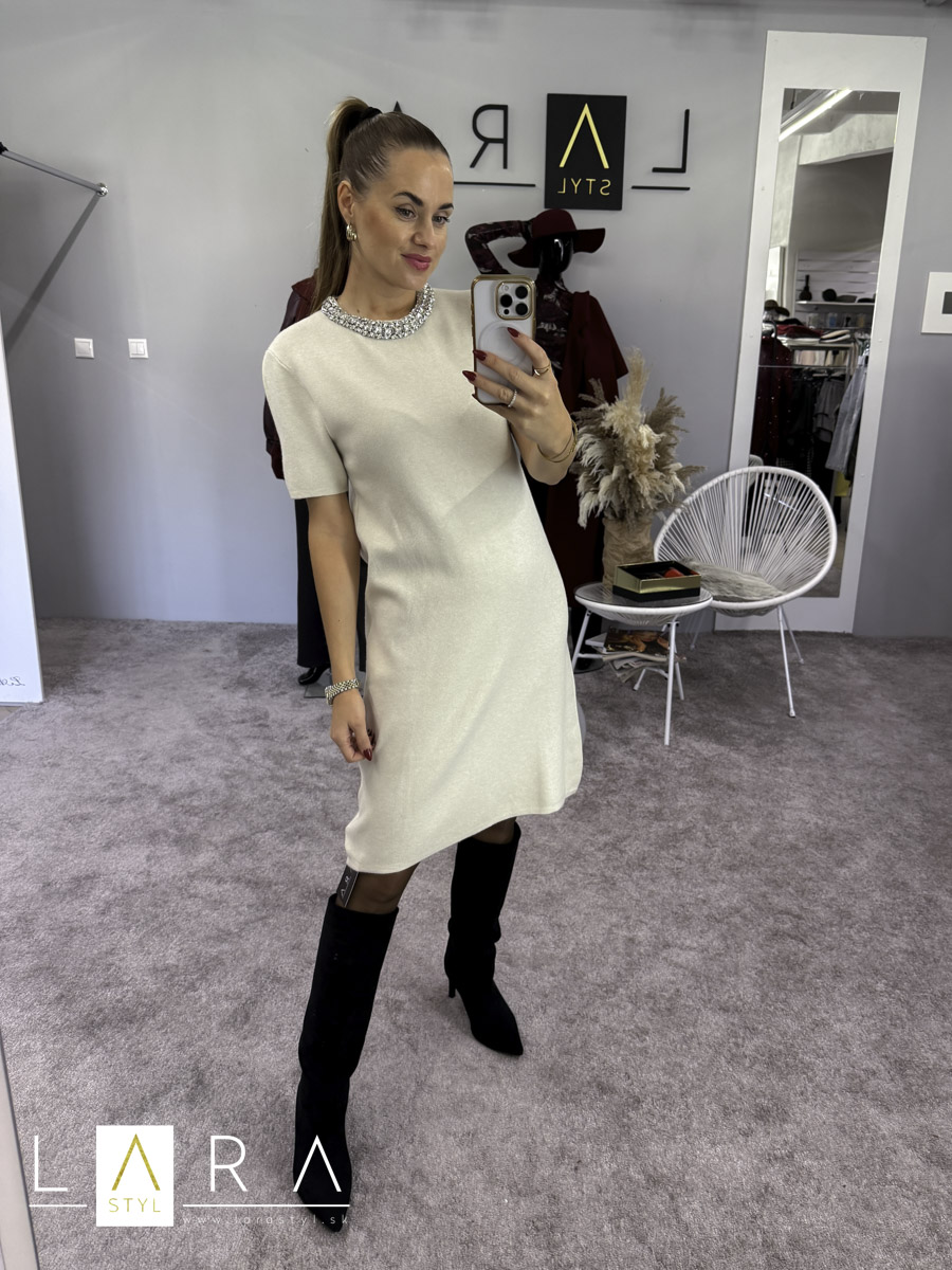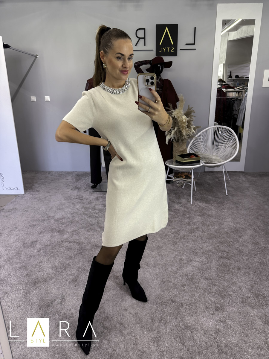 Krátke úpletové šaty s krátkym rukávom, okol krku štraz. Šaty sú mierne áčkového strihu. Modelka má výšku 165 cm.