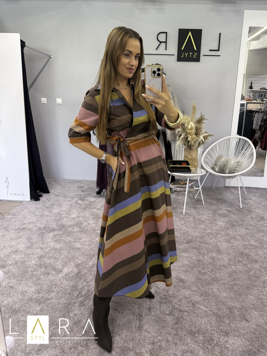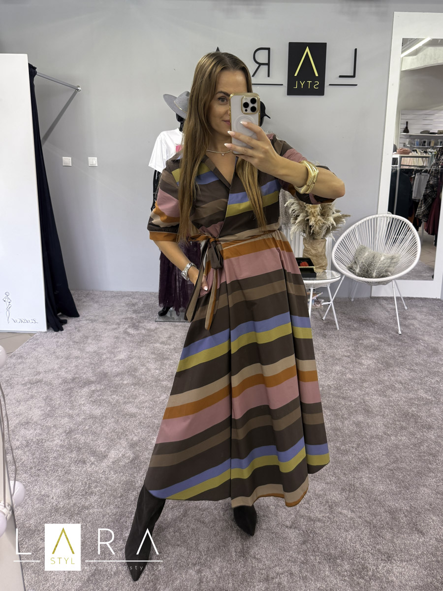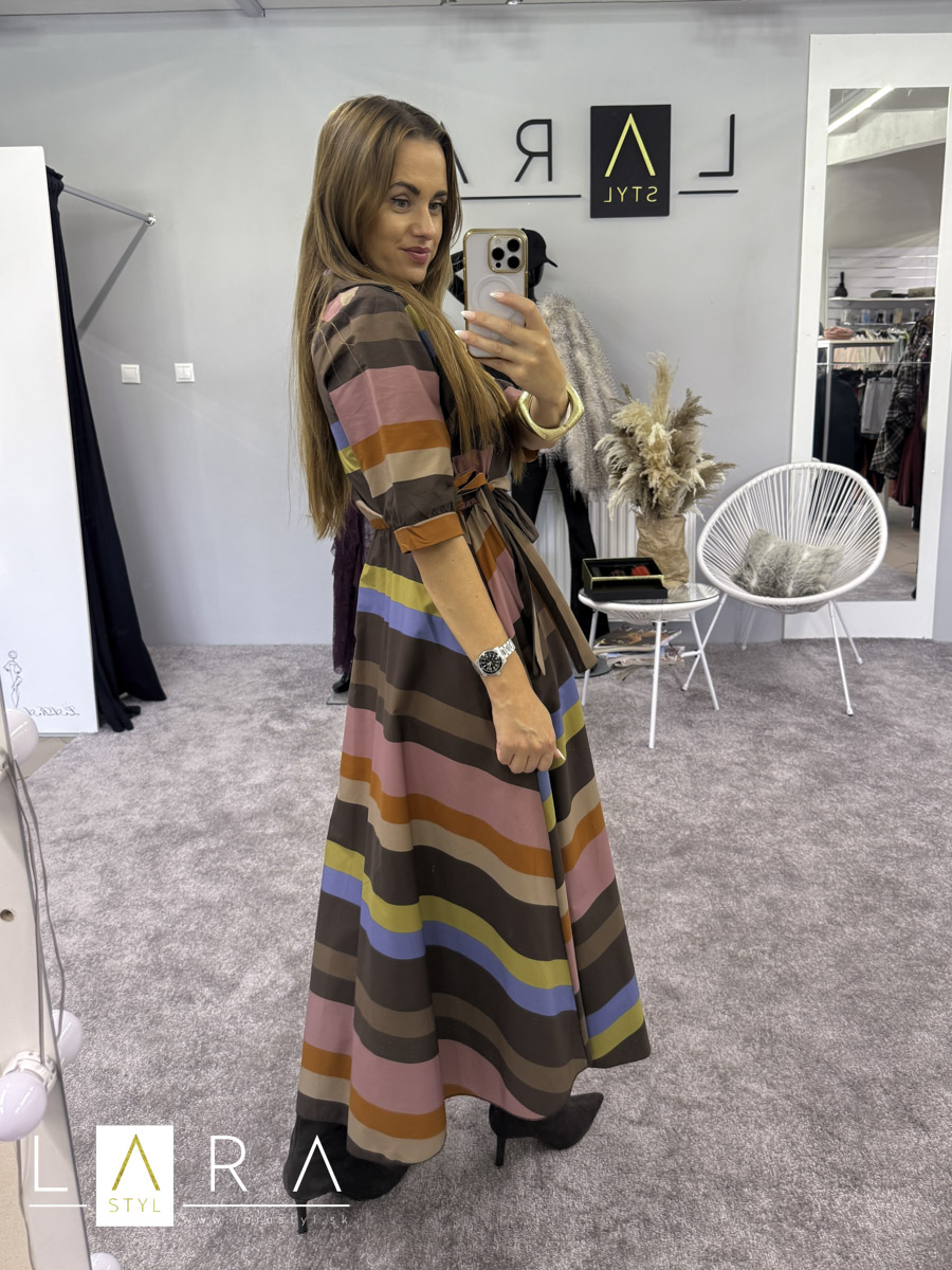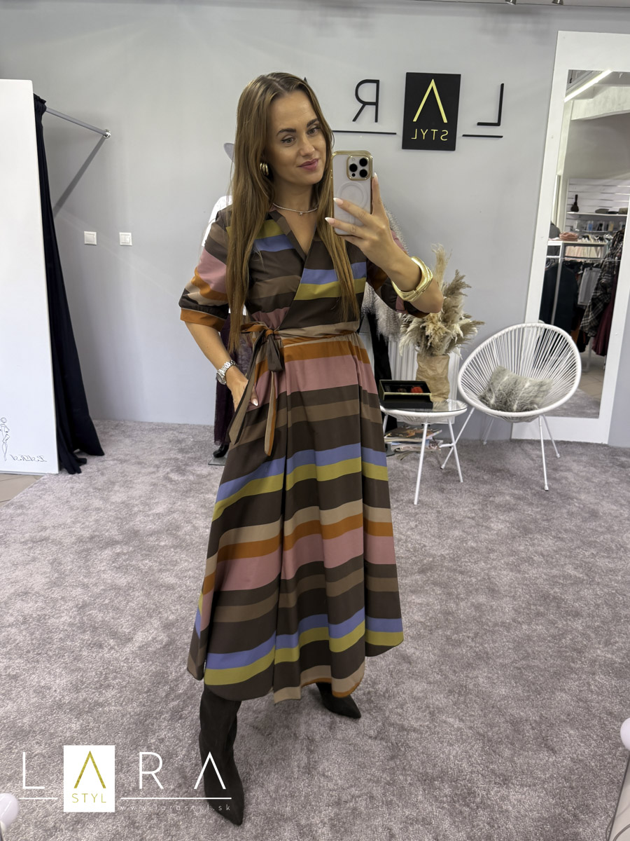Midi šaty v nádherných farebných kombináciách vo farbách jesene, pásikavé, v páse gumička plus viazanie, šaty majú bočné vrecká. Modelka má výšku 165 cm.