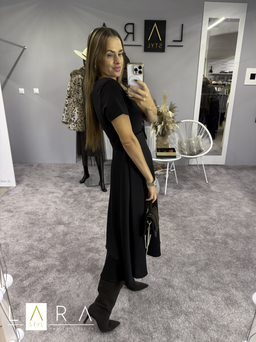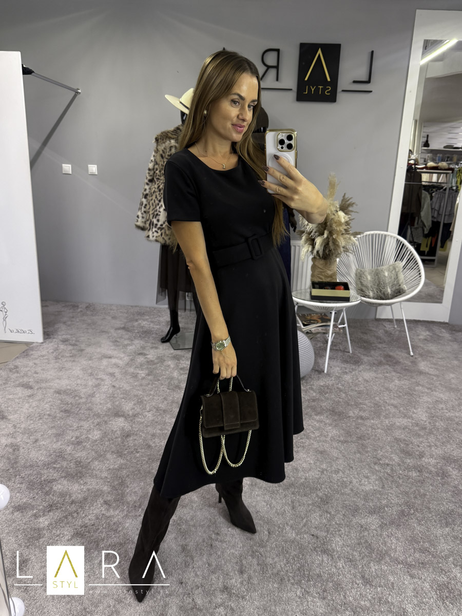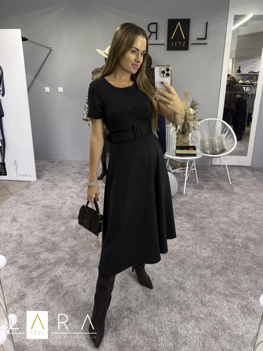 Midi šaty s opaskom sú z príjemného elastického materiálu, s krátkym rukávom, okrúhlym výstrihom, v páse sú prestrihnuté, sukňa áčkového strihu. Opasok je súčasťou. Modelka má výšku 165 cm.