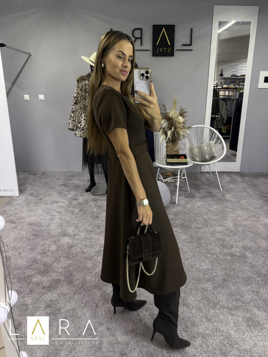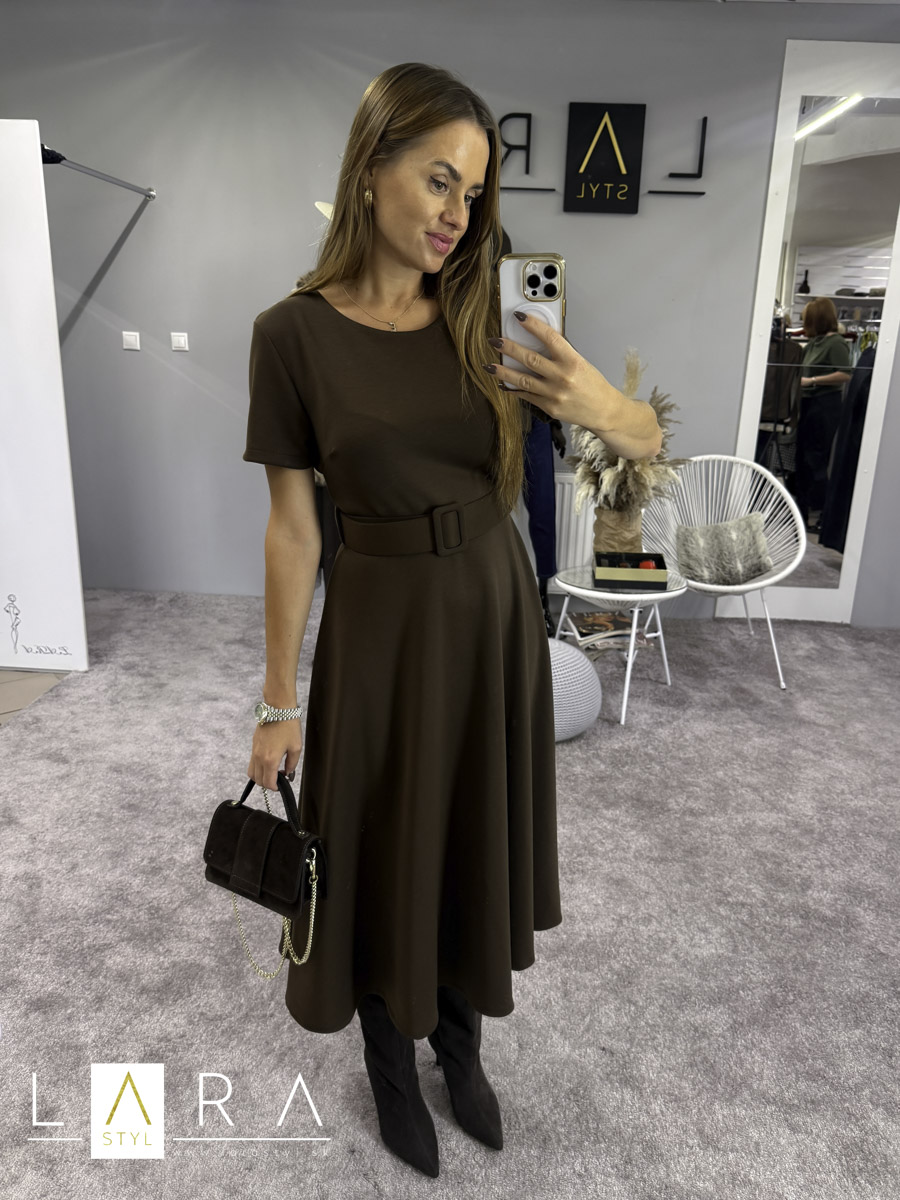 Midi šaty s opaskom sú z príjemného elastického materiálu, s krátkym rukávom, okrúhlym výstrihom, v páse sú prestrihnuté, sukňa áčkového strihu. Opasok je súčasťou. Modelka má výšku 165 cm.