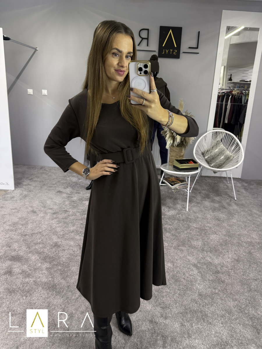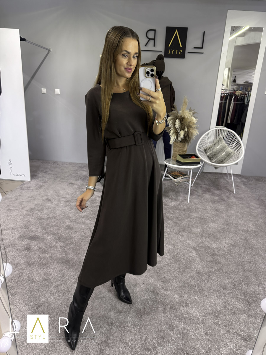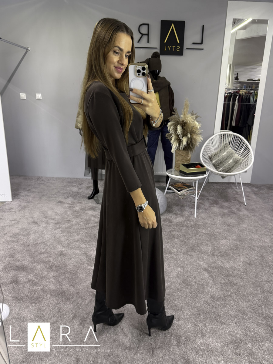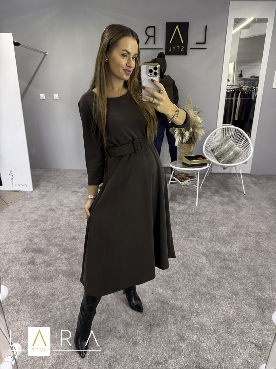 Midi šaty s opaskom sú z príjemného elastického materiálu, s 3/4 rukávom, okrúhlym výstrihom, v páse sú prestrihnuté na gumičku, sukňa áčkového strihu. Opasok je súčasťou. Modelka má výšku 165 cm.