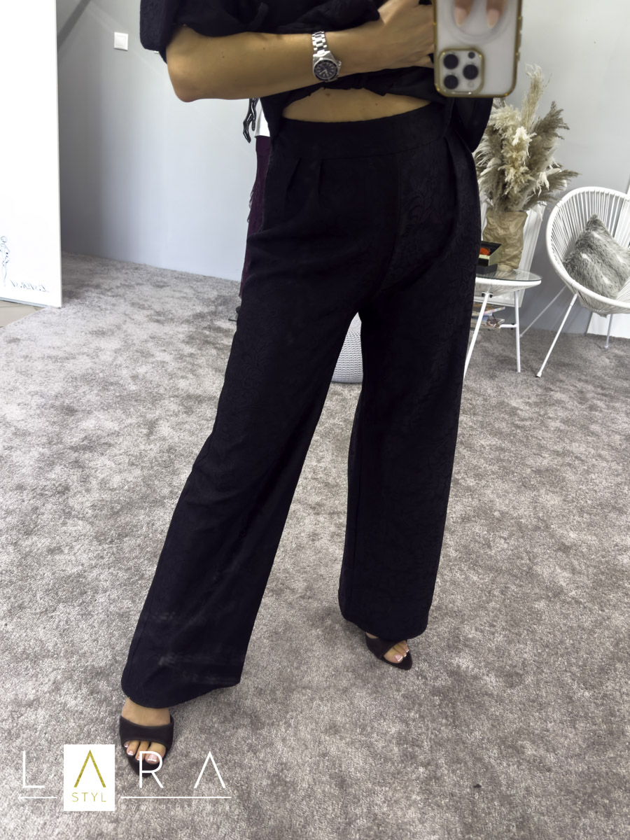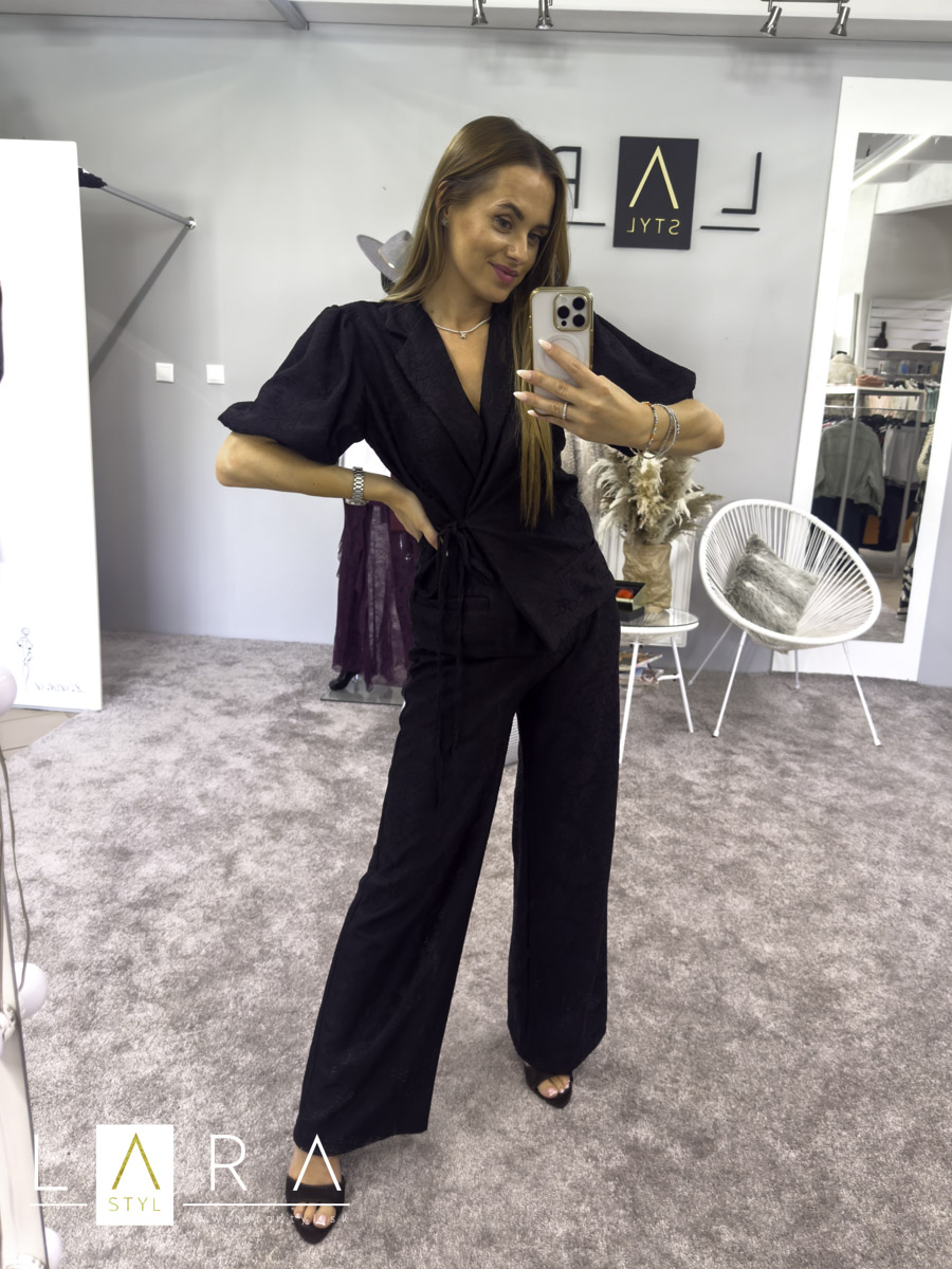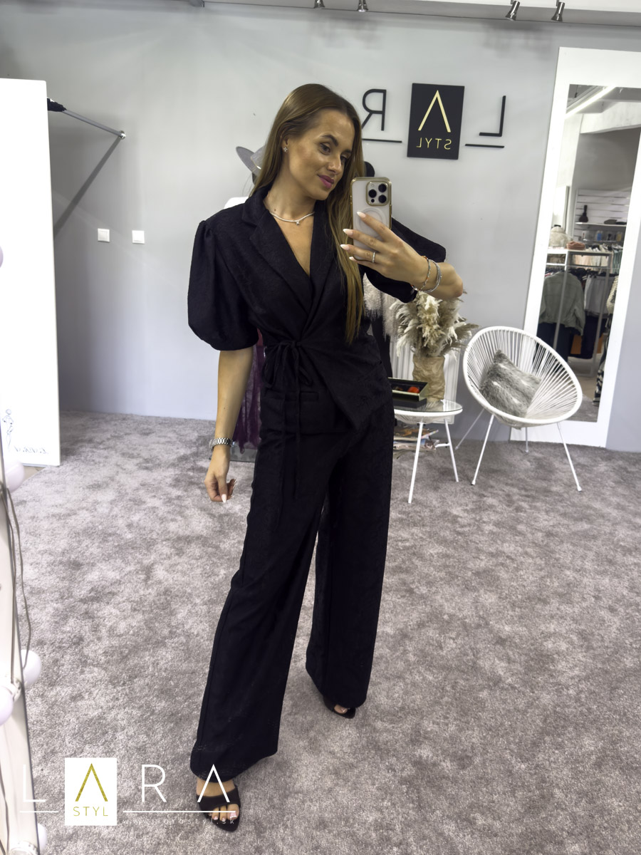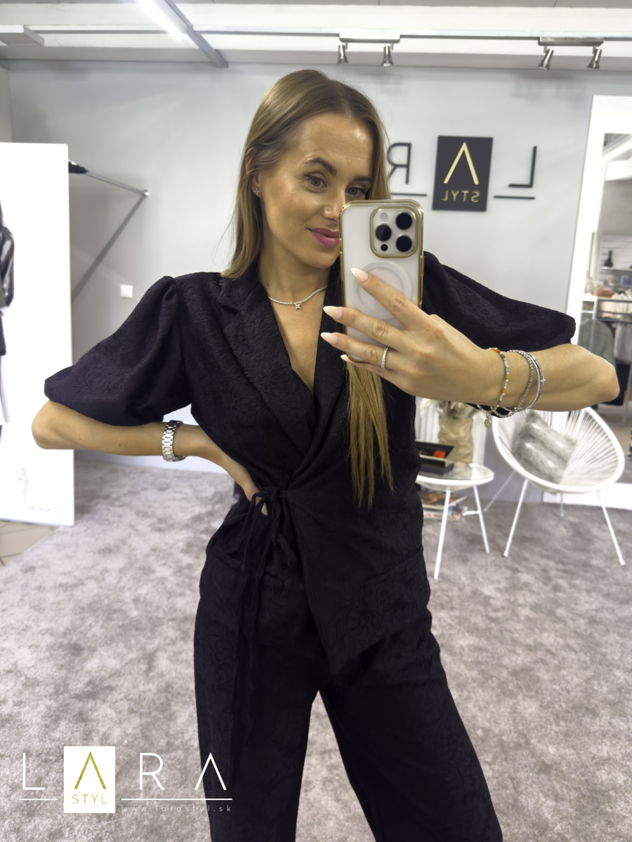 Štýlový a pohodlný nohavicový komplet v čiernej farbe, ktorý sa stane základom vášho šatníka. Komplet je z príjemného materiálu, čiernej farby a jemná krajková potlač. skladá sa z nohavíc v páse gumička na boku zips a saka s pufovanými rukávmi. Sako má zapínanie na viazanie. Modelka má výšku 165 cm.