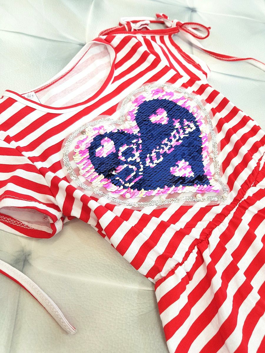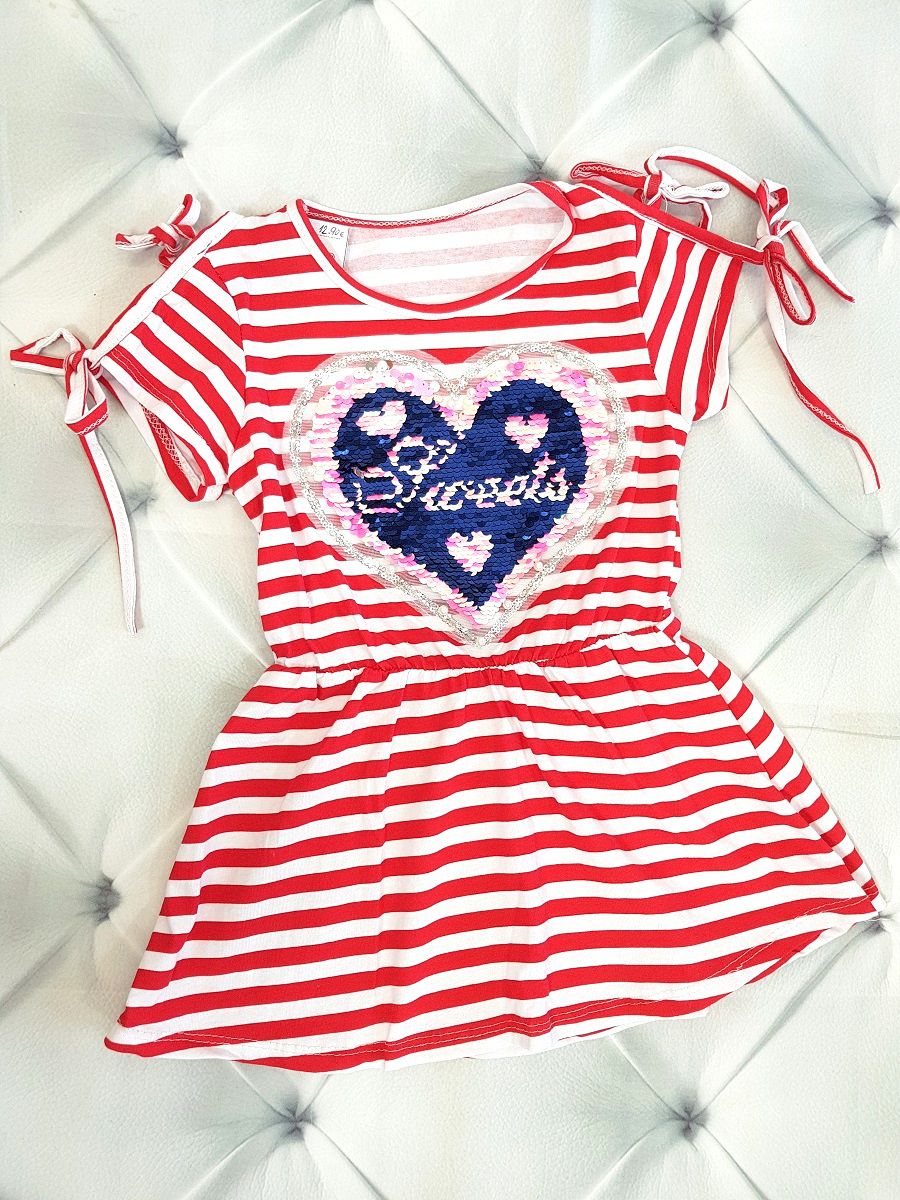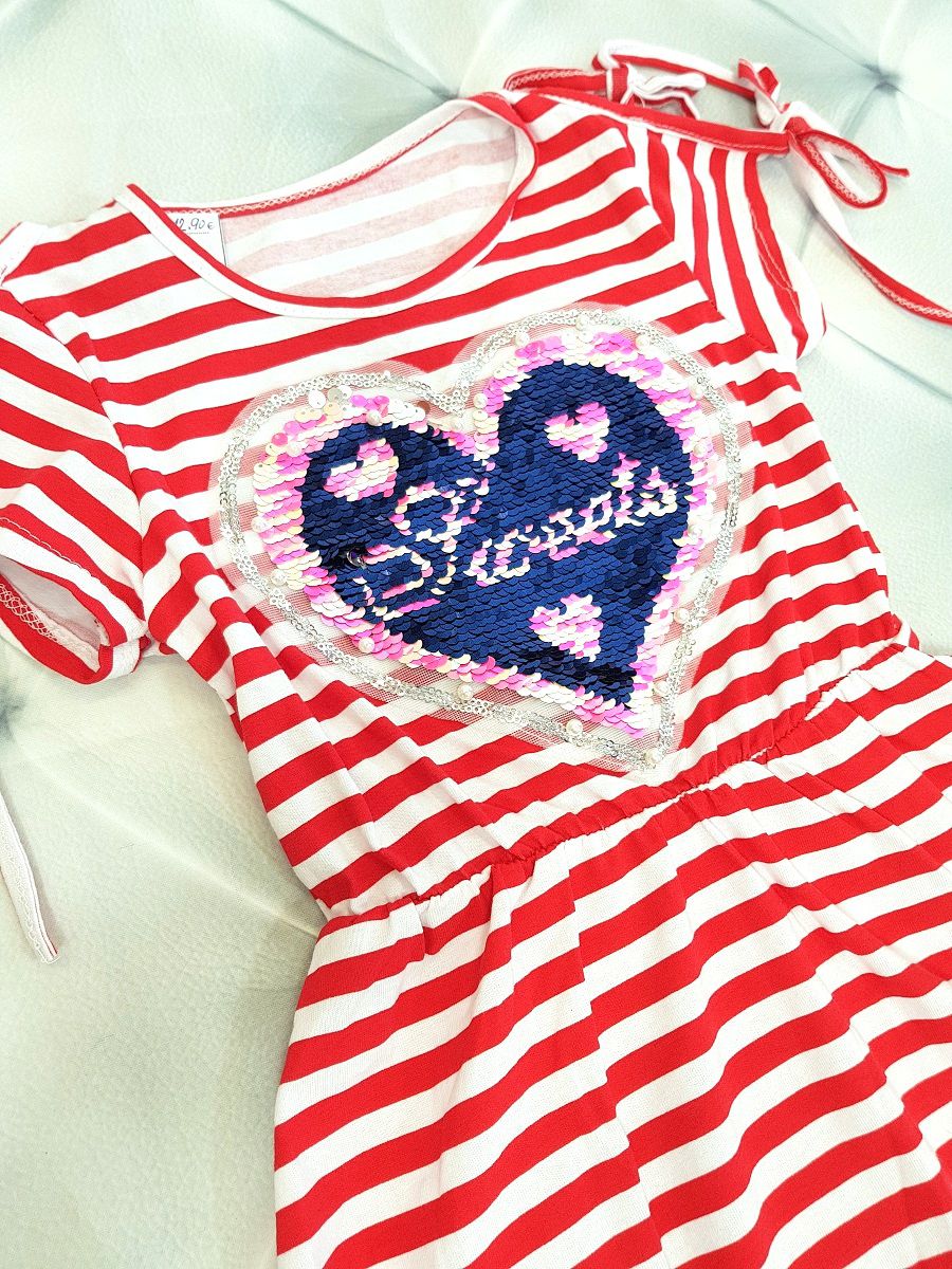 Pásikavé šaty s viazaním na rukávoch, zdobené flitrovaným srdiečkom a gumou v páse.
