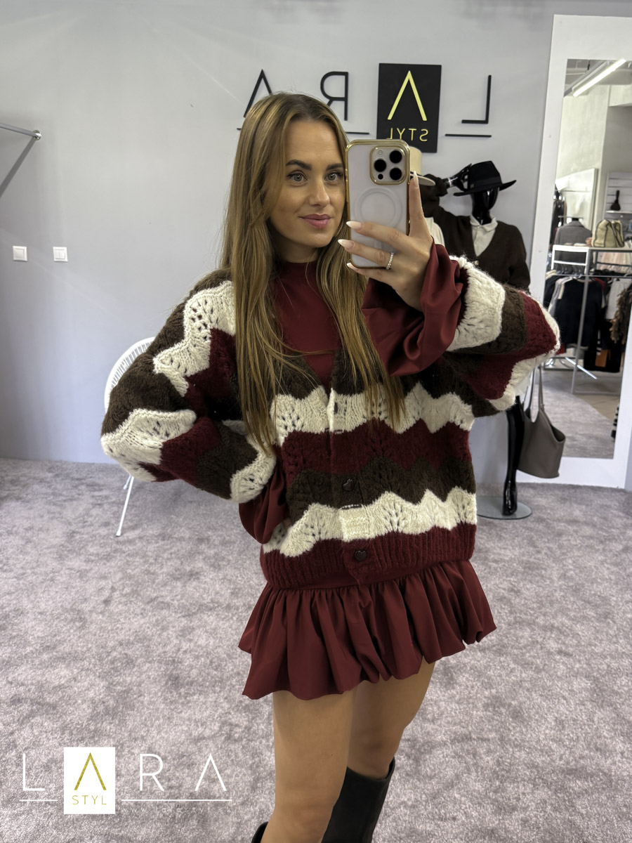 Štýlový dámsky sveter, pletený, pasikavý, zapínanie na gombíky s výtrihom do tvaru V. Jednoduchý vzor a štýlové gombíky v tvare srdiečka . Modelka má výšku 165 cm.