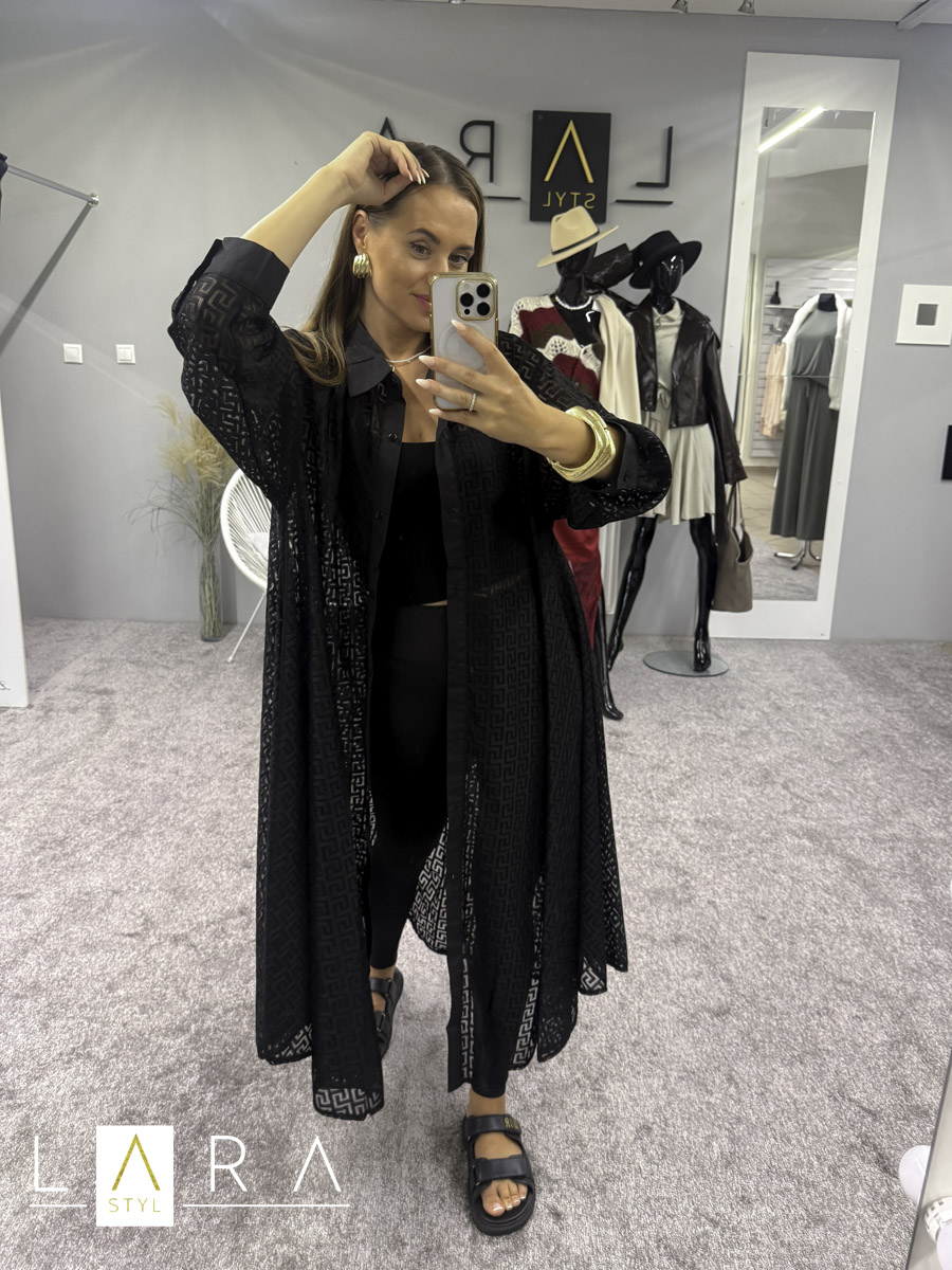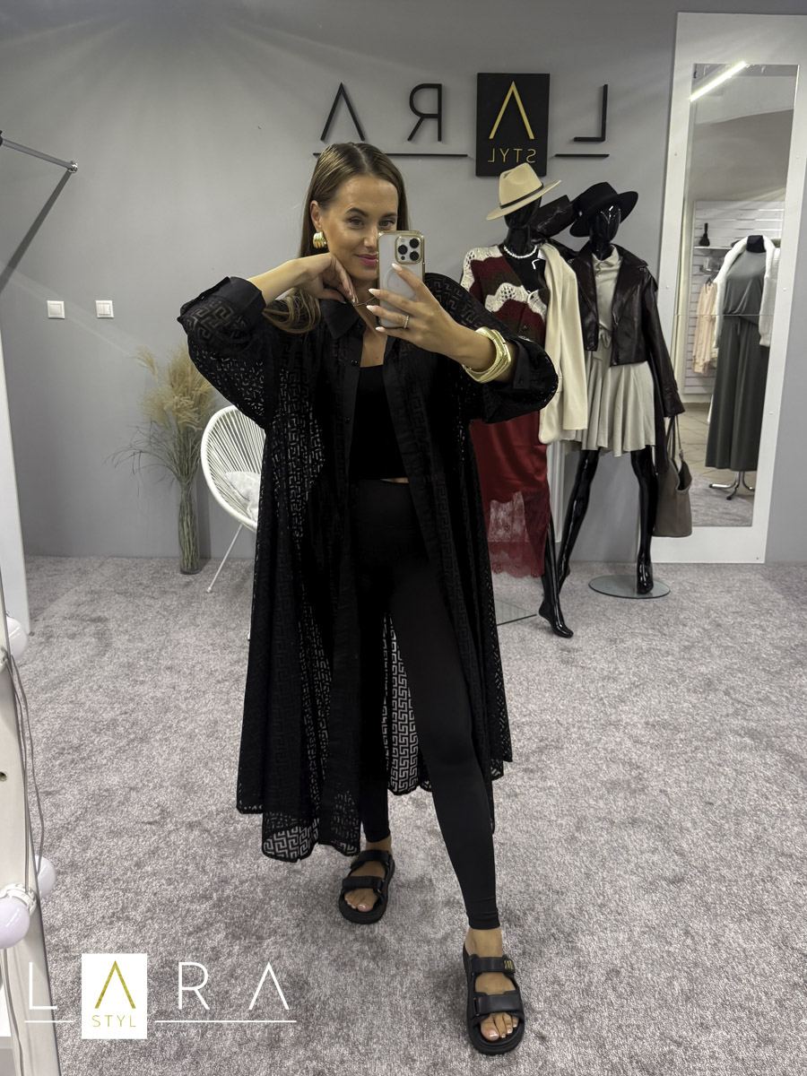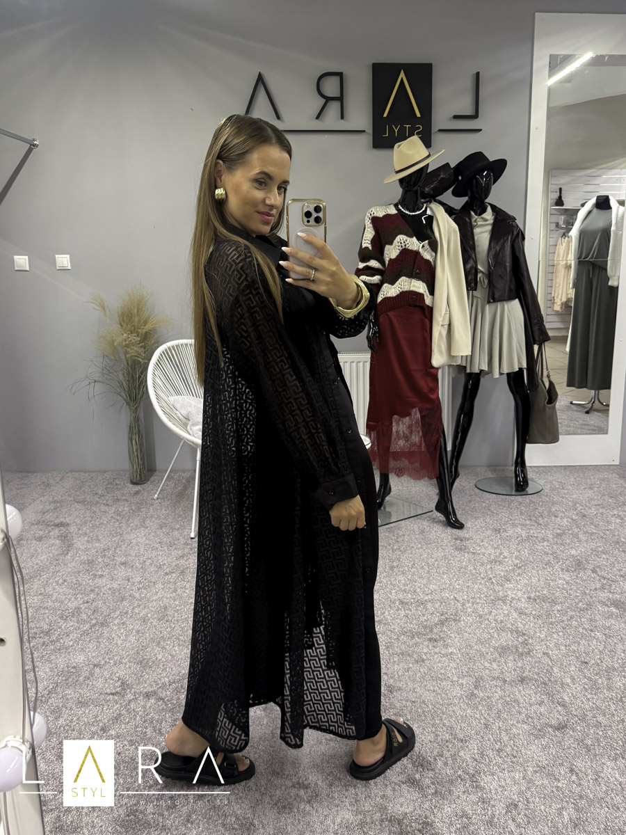 Dlhé čierne šaty, kardigan, z priesvitnej látky, ľahký a vzdušný materiál s pravidelným geometričkým vzorom, pri krku golierik, zapínanie na gombíky, strih mierne do Áčka, na konci rukáva patent a zapínanie na gombík. Modelka má výšku 165 cm.