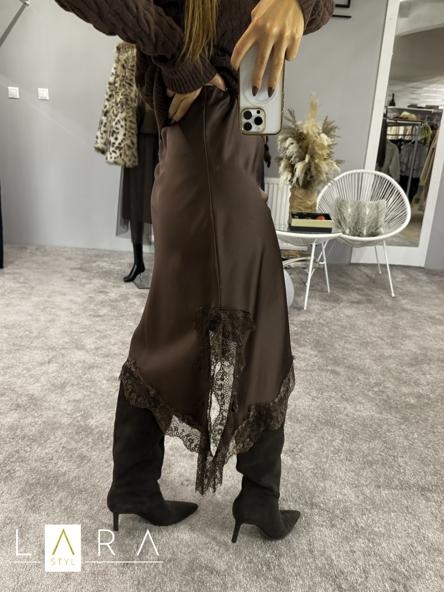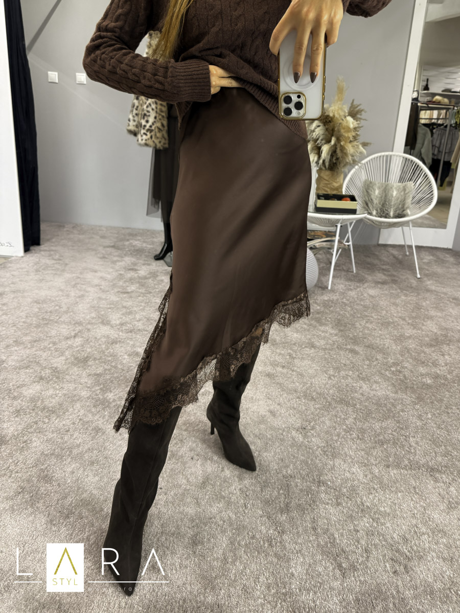 Úvod » Kraťasy - Sukne » Saténová sukňa s čipkou, hnedá