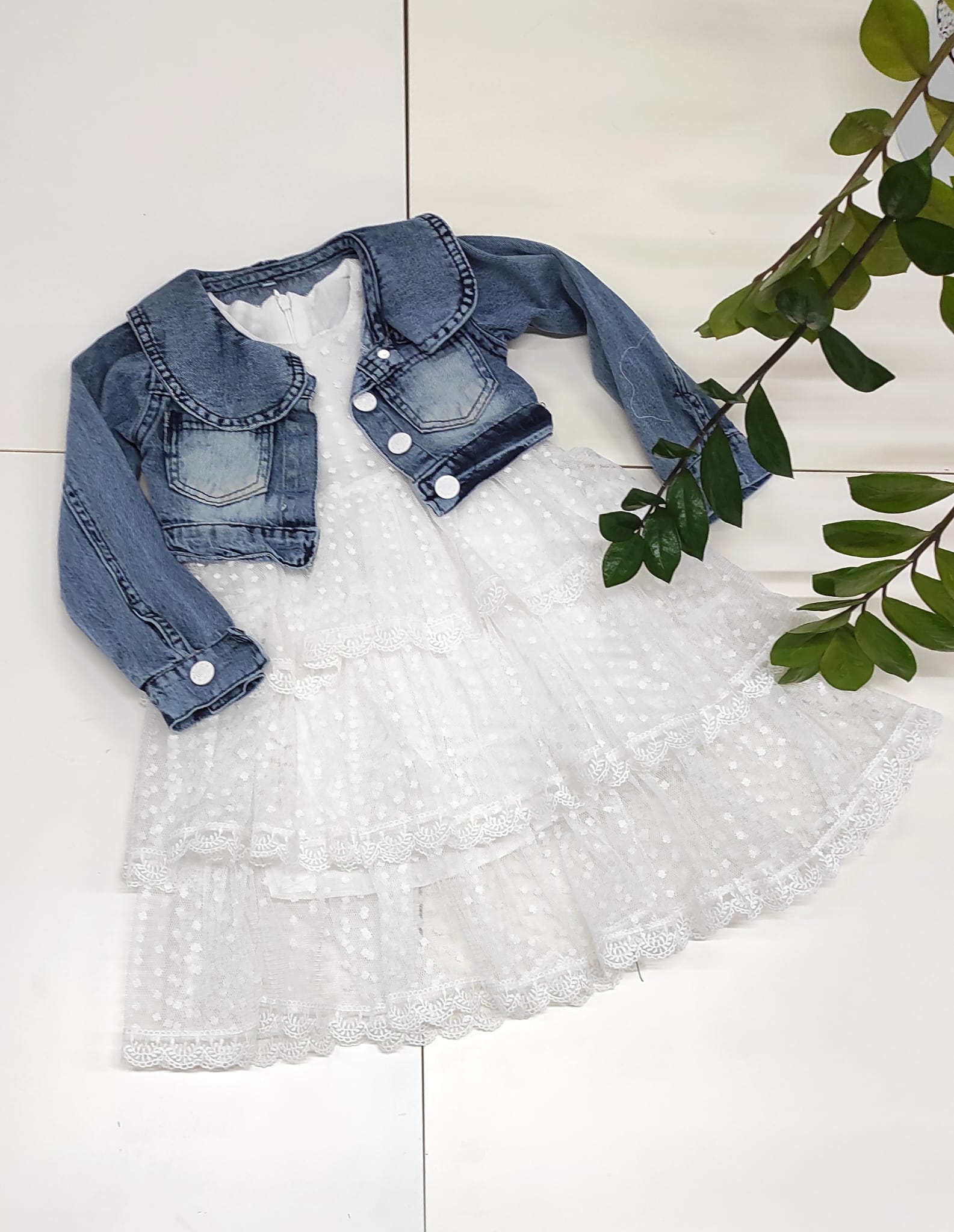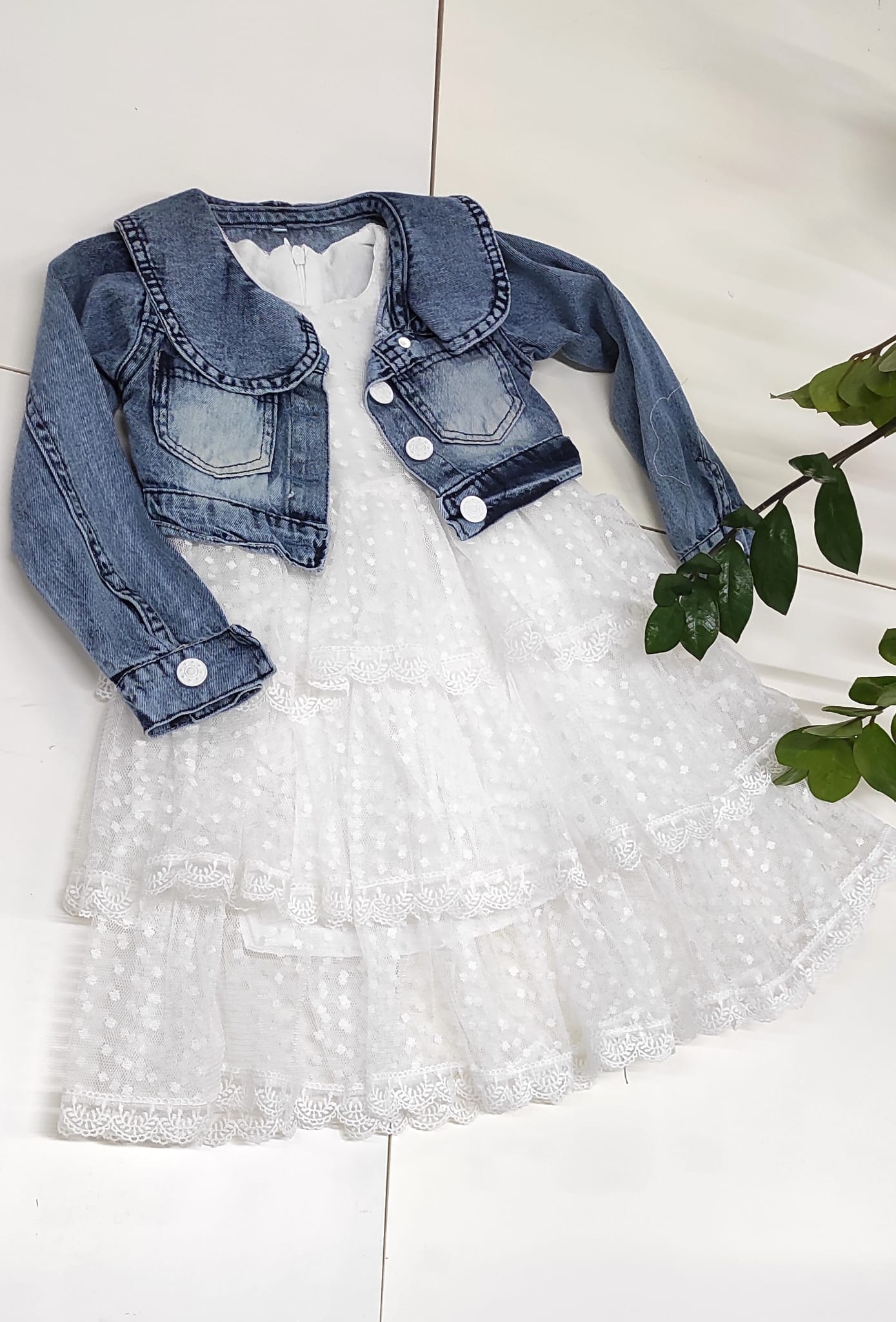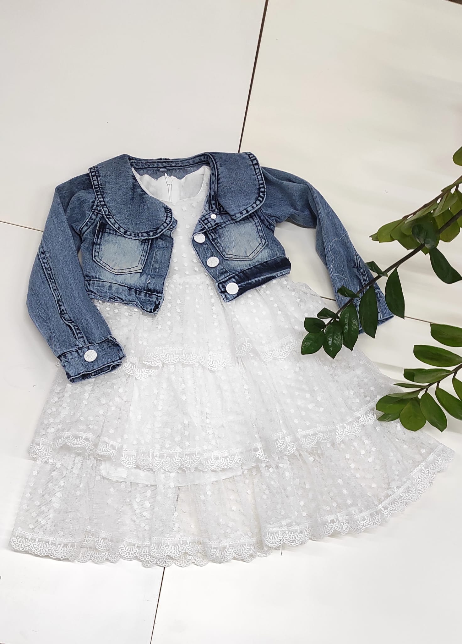 Šaty LEONE s nariasnou tylovou sukničkou. Zapínanie je na zips v zadnej časti. Džínsová bundička je súčasťou.