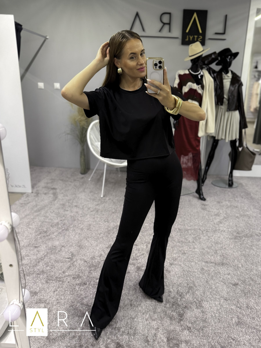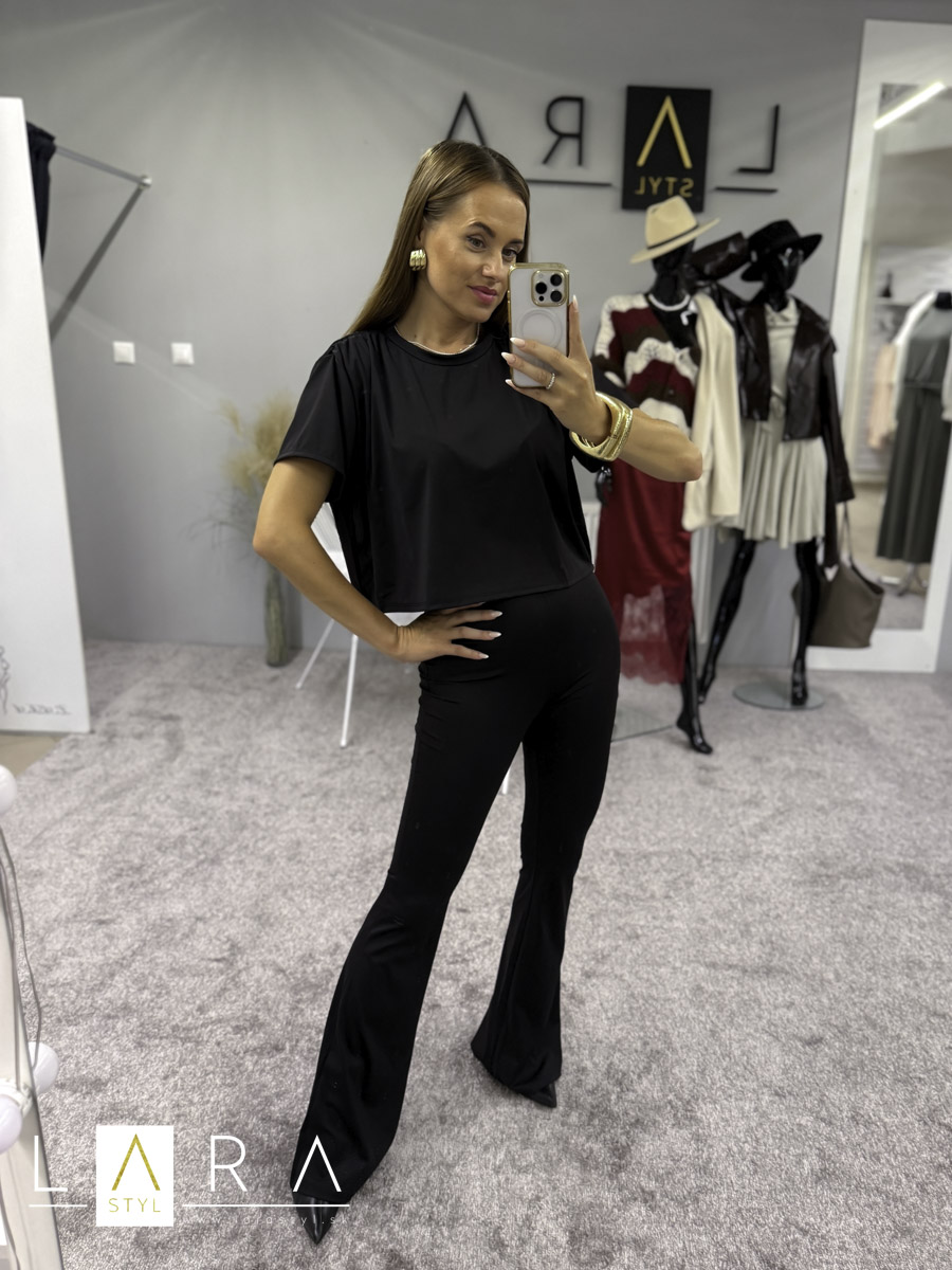 Štýlový a pohodlný športový komplet pozostáva z topu, ktorý má na ramenách jemné riasenie a zvonových nohavíc, v páse na gumičku. Modelka má výšku 165 cm.