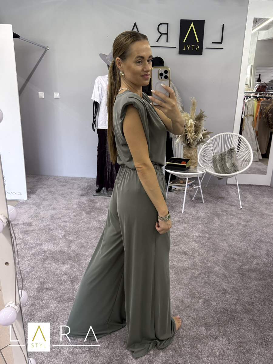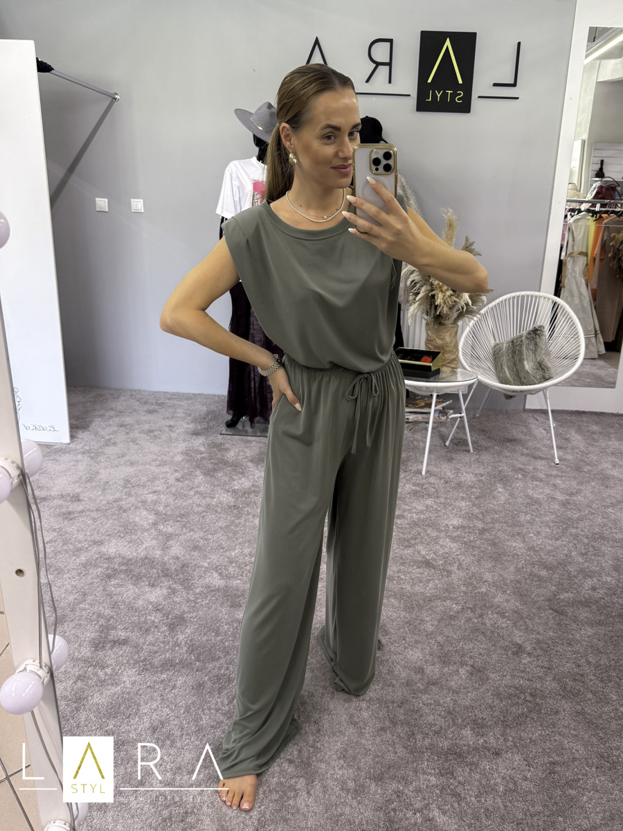 Štýlový a pohodlný športový komplet pozostáva z topu, ktorý má výložky na ramenách a zo širokých nohavíc, v páse na gumičku. Modelka má výšku 165 cm.