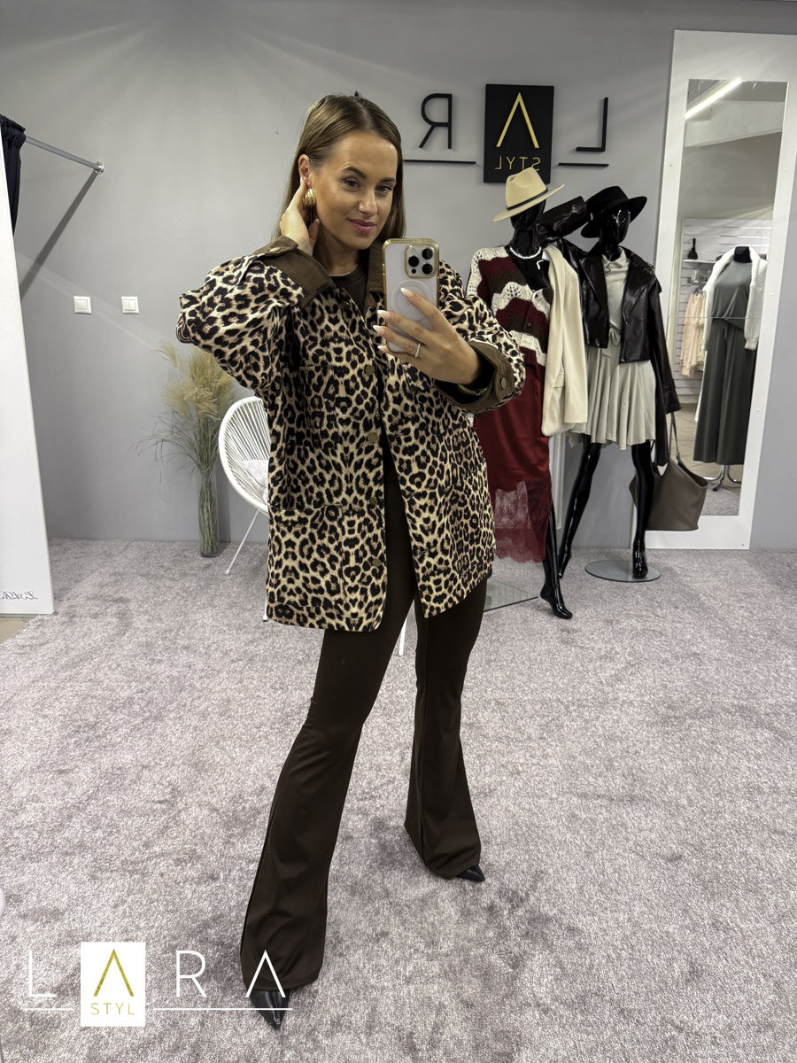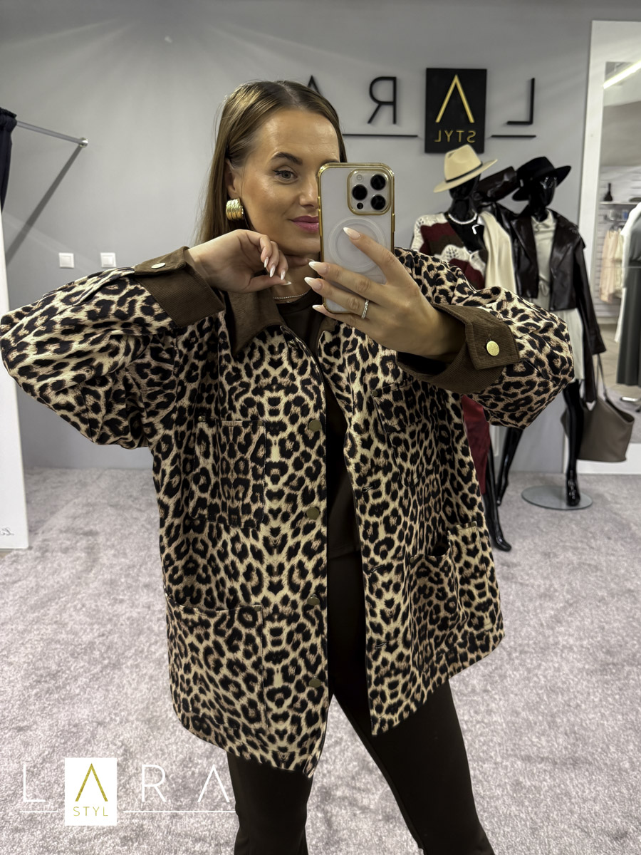 Štýlová dámska bunda s leopardím vzorom, bunda má podšívku a dve vrecká, kombinová je jednofarebnou menčestrovinou, zapínanie na gombíky. Modelka má výšku 165 cm.