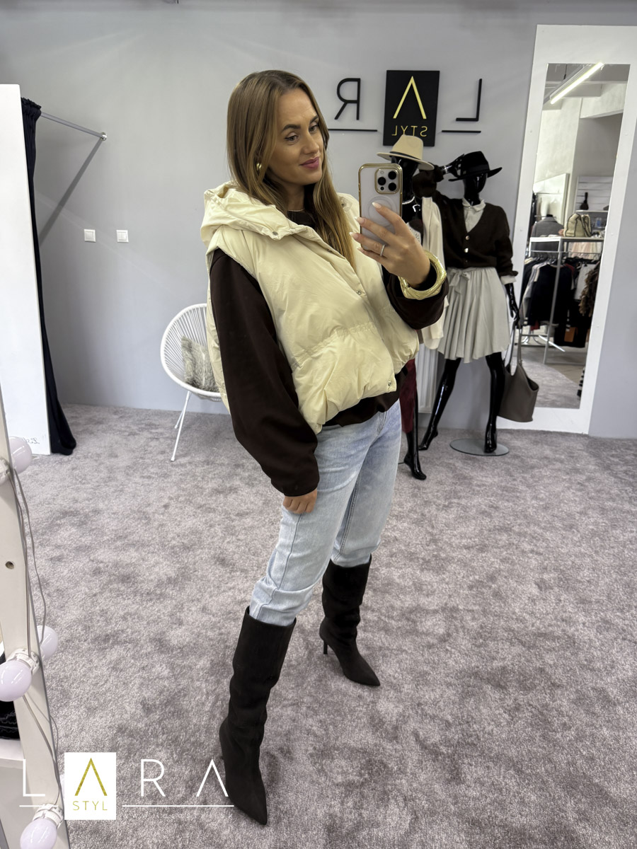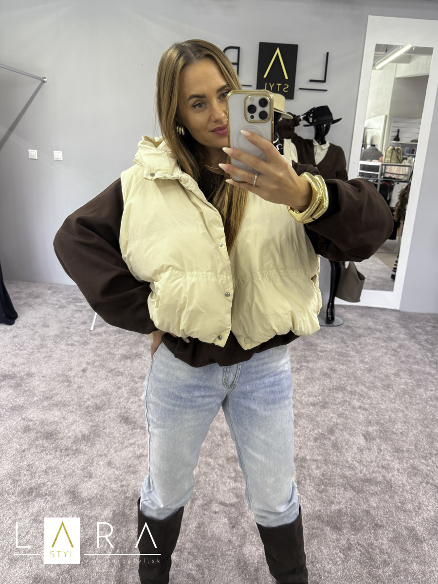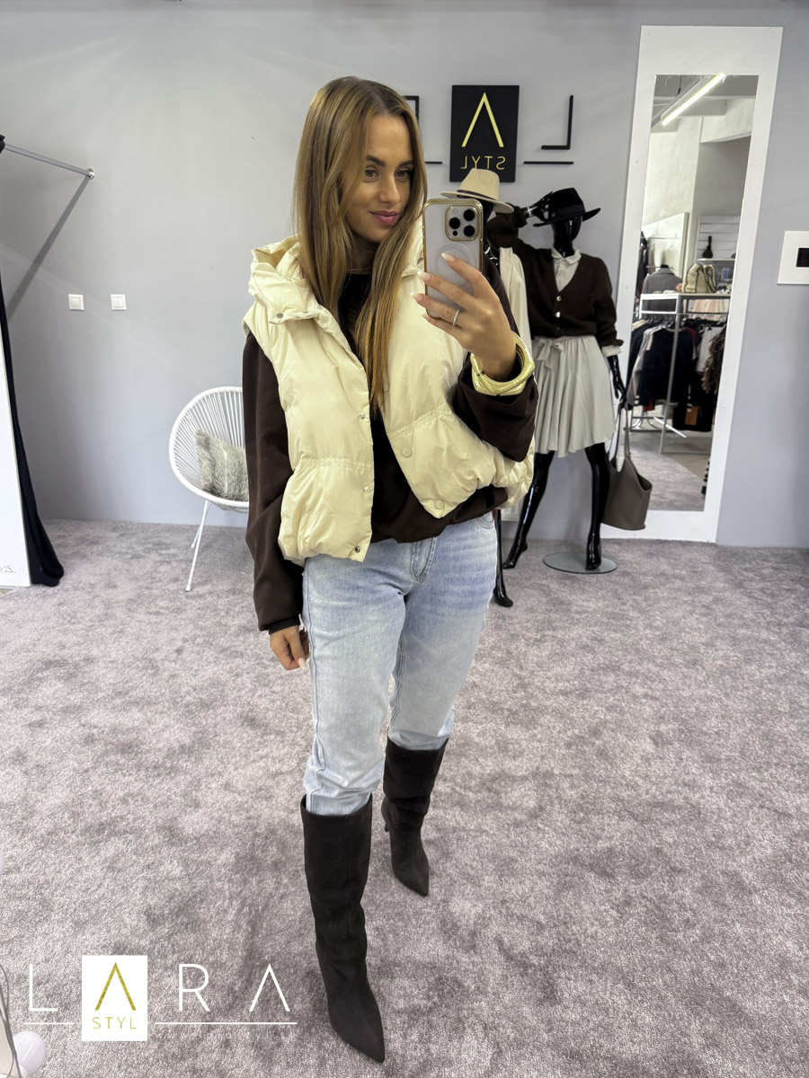 Štýlová balónová vesta s kapucňou so zapínaním na gombíky po celej dĺžke Modelka má výšku 170 cm.