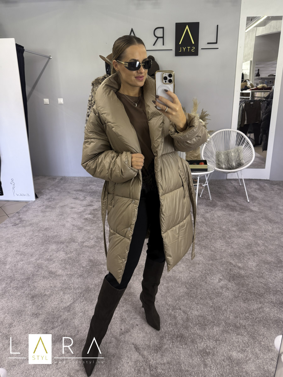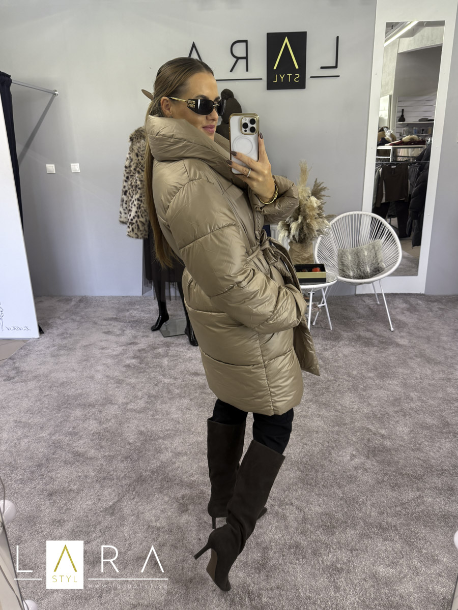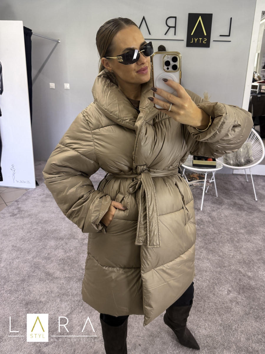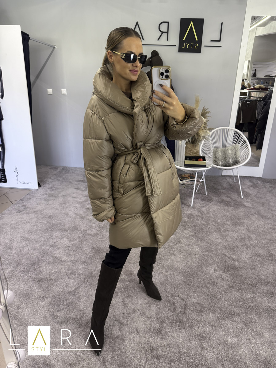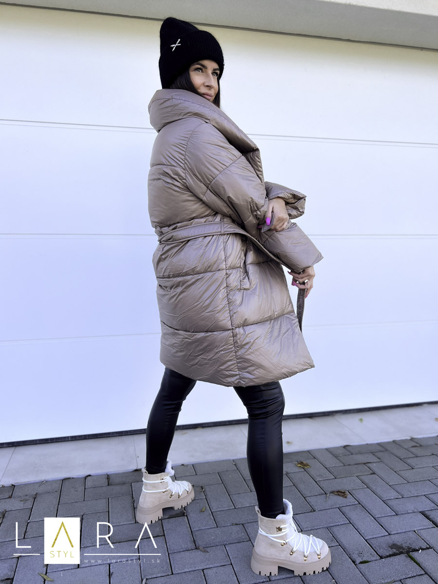 Predĺžená dámska zimná bunda so zapínaním na gombíky po celej dĺžke, súčasťou bundy je opasok. V bočnej časti sa nachádzajú vrecká. Modelka má výšku 170cm.