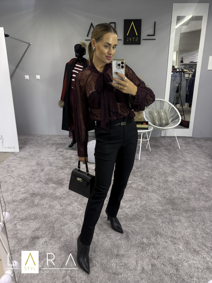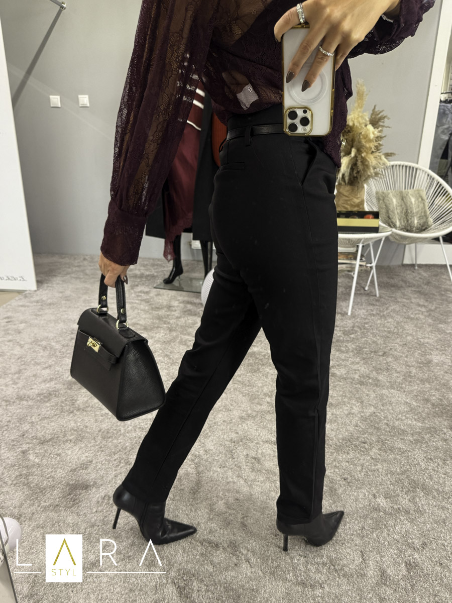 - Štýlové dámske elegantné nohavice s opaskom, v páse klasické zapínanie na zips a gombík. Nohavice sú z elastického materiálu. Modelka má výšku 165 cm.