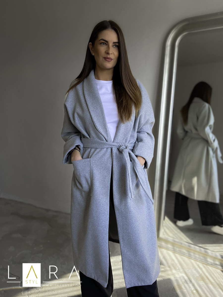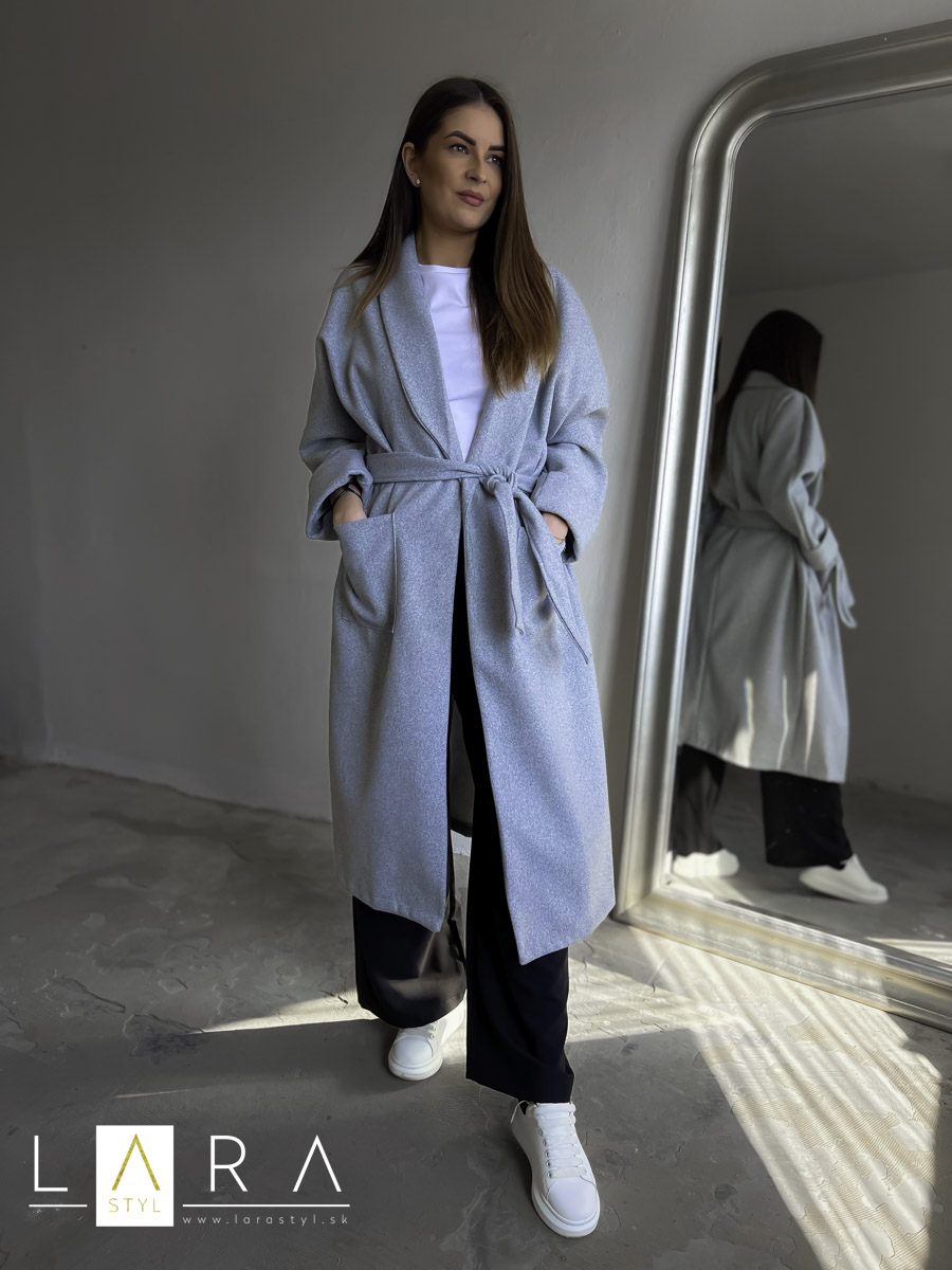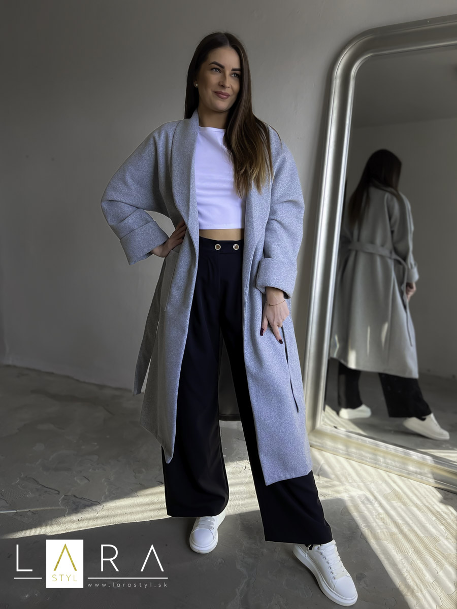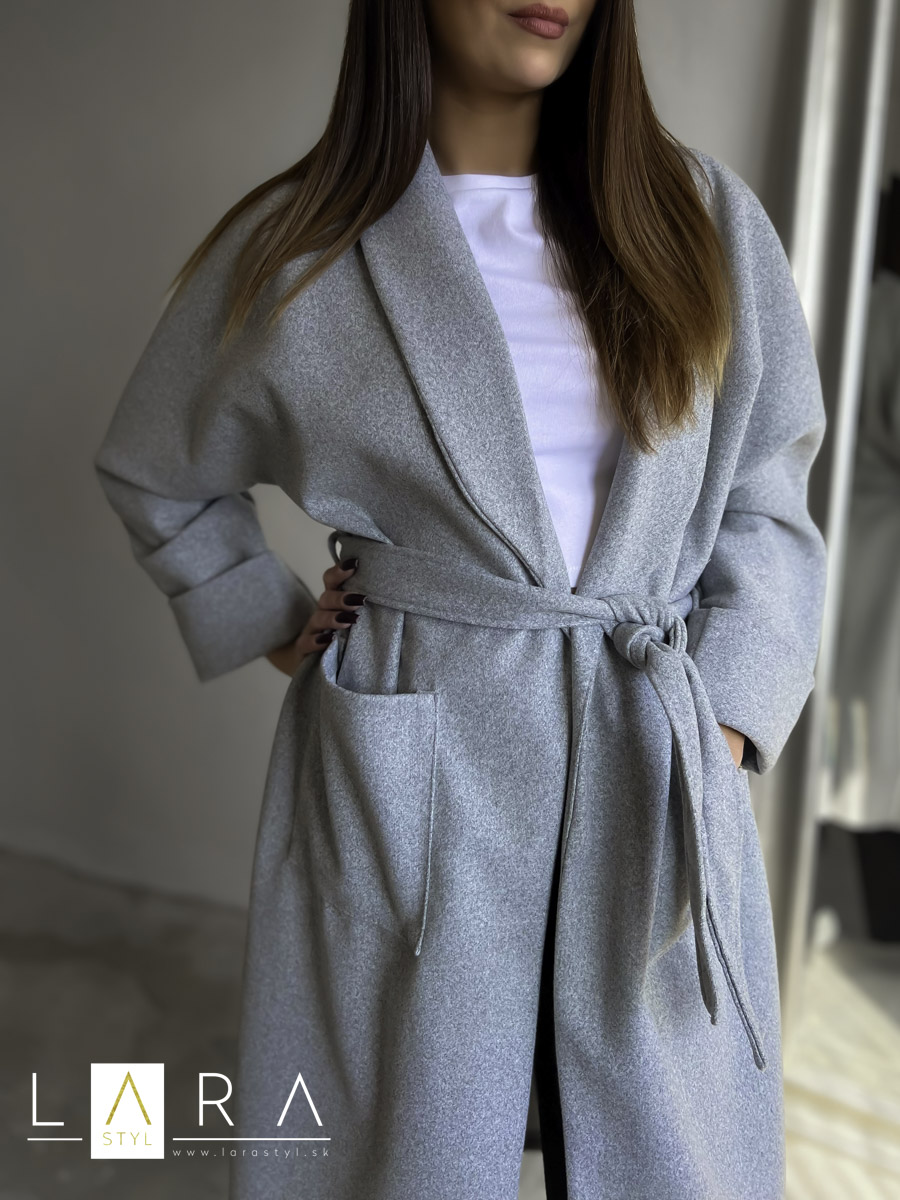 Štýlový dámsky kabát s dlhým rukávom, na kabáte sa nachádzajú vrecká. Súčasťou kabátu je látkový opasok. Rukávy na kabáte sa dajú podkasať. Modelka má výšku 170 cm.