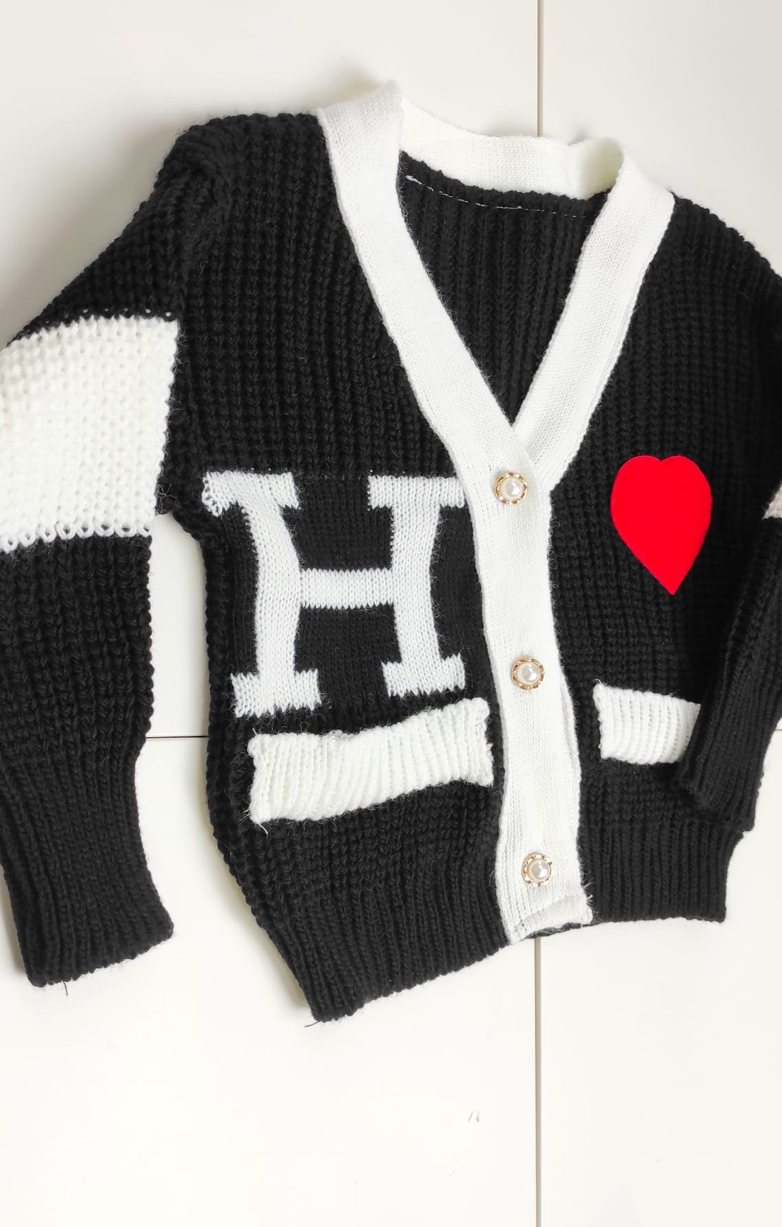 Sveter HEART s dlhými rukávmi, s V-čkovým výstrihom, sveter je so zapínaním na gombíky, v hornej časti zdobený srdiečkom.