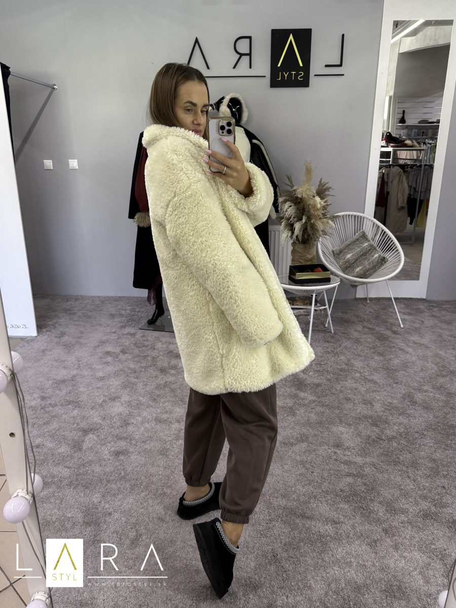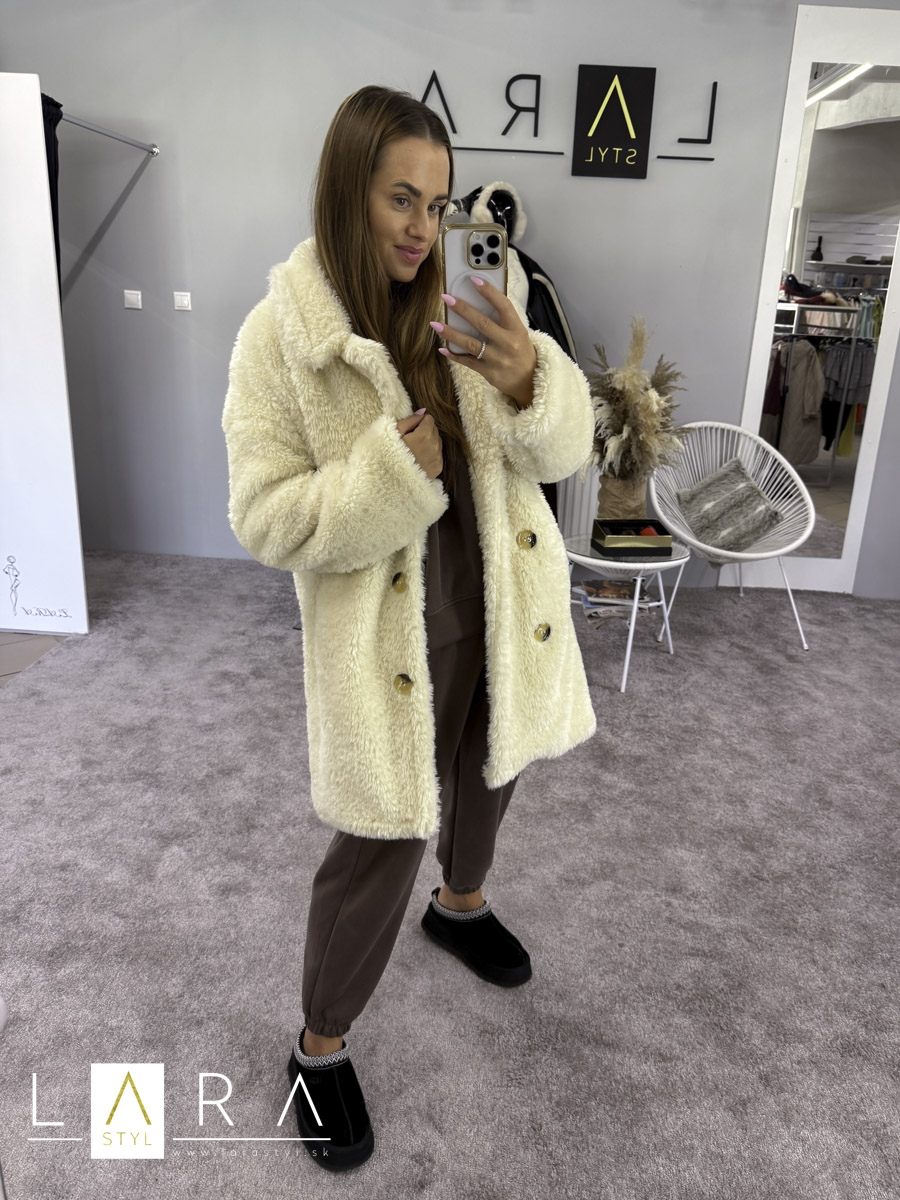 Predĺžený tedy kabátik vyrobený z mäkkučkého materiálu. Kabátik je futrovaný, zapínanie je na gombíky. V prednej časti sa nachádzajú vrecká. Modelka má výšku 164cm.