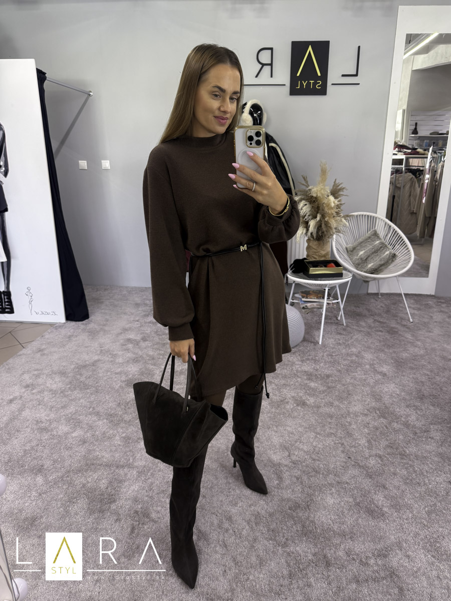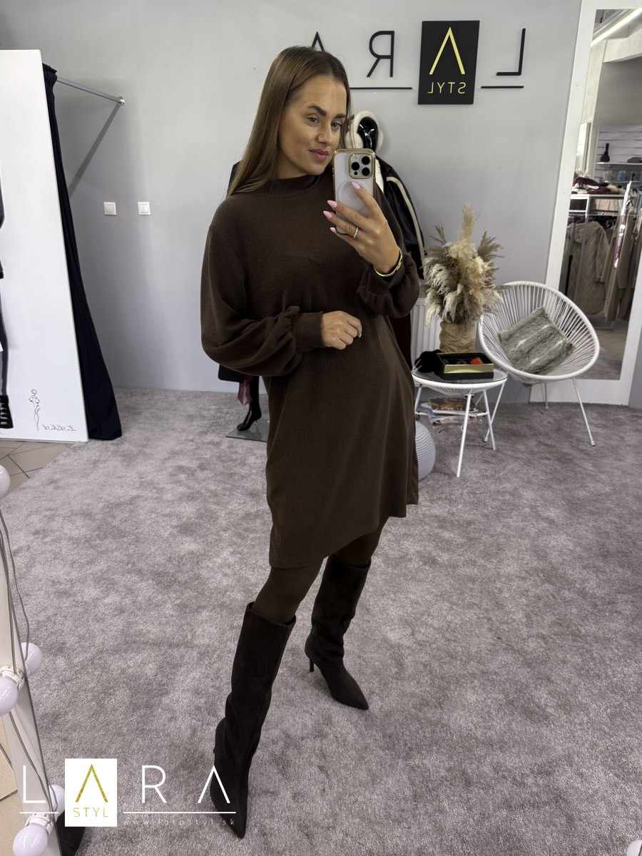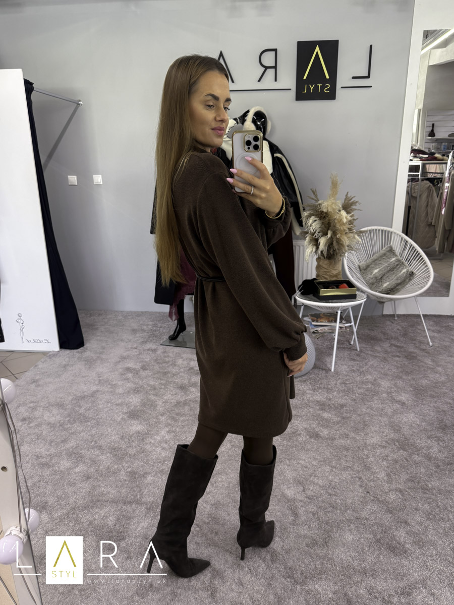 Úpletové šaty s opaskom a mienym stojačikom pri krku, panent na konci rukávov.Šaty majú po stranách vrecká.