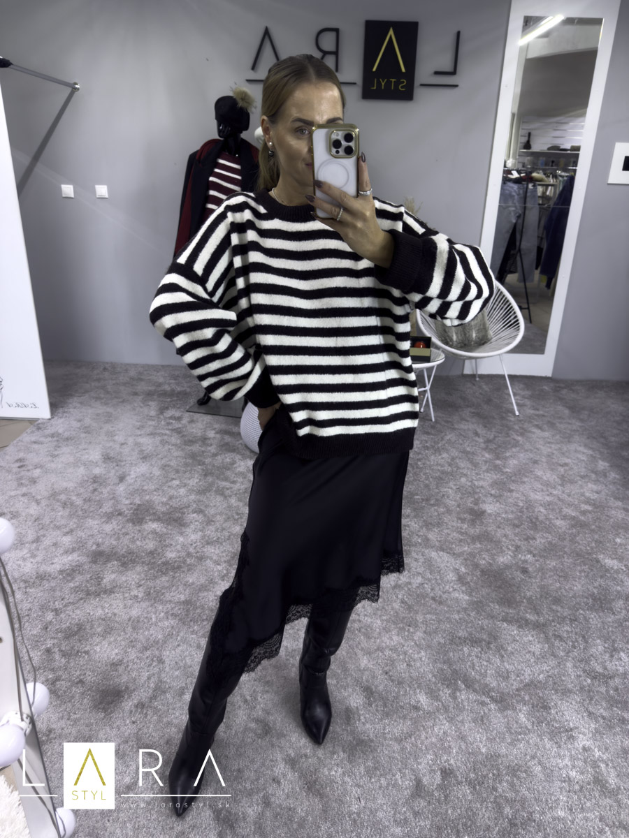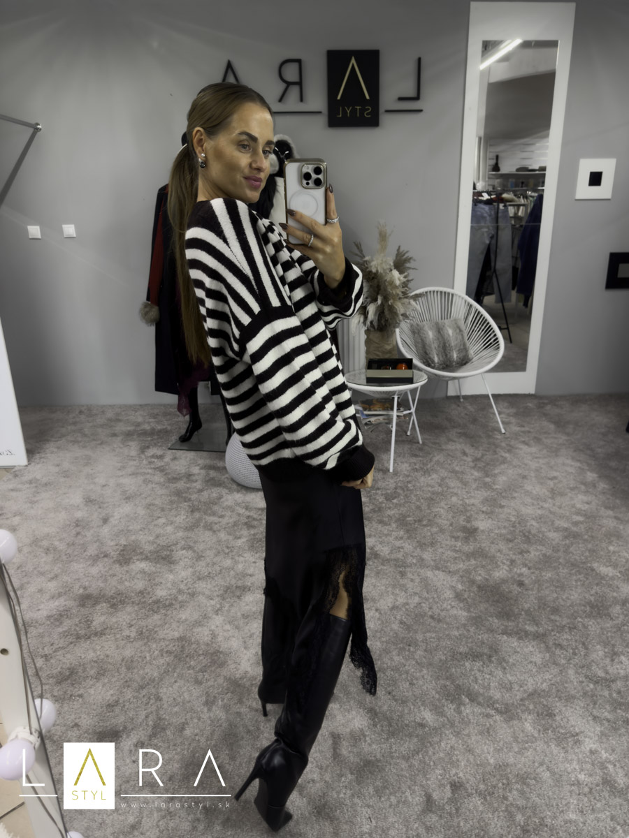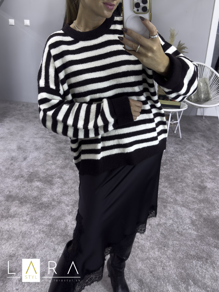 Dámsky pulóver pásikavý, tmavohnedý s béžovou. Pulóver je voľnejšieho oversize strihu. Modelka má výšku 165 cm.