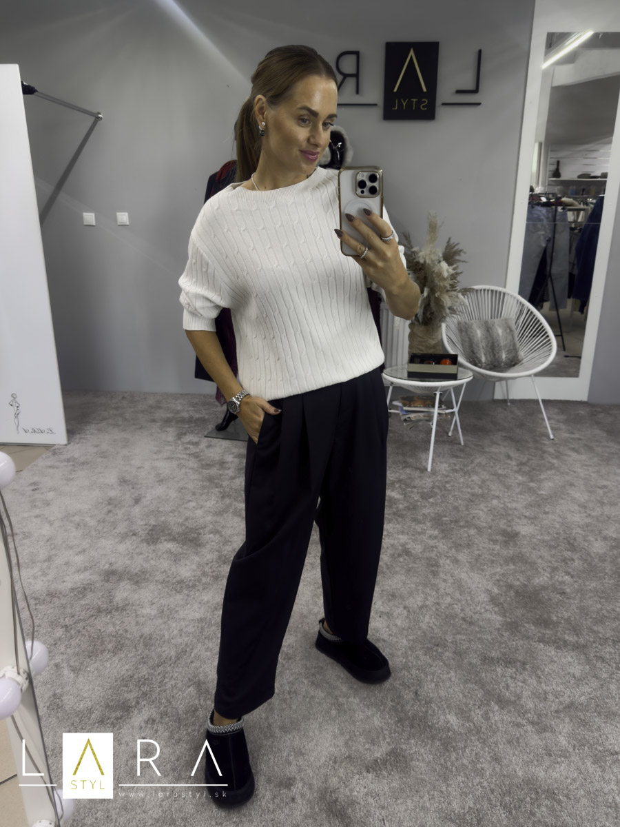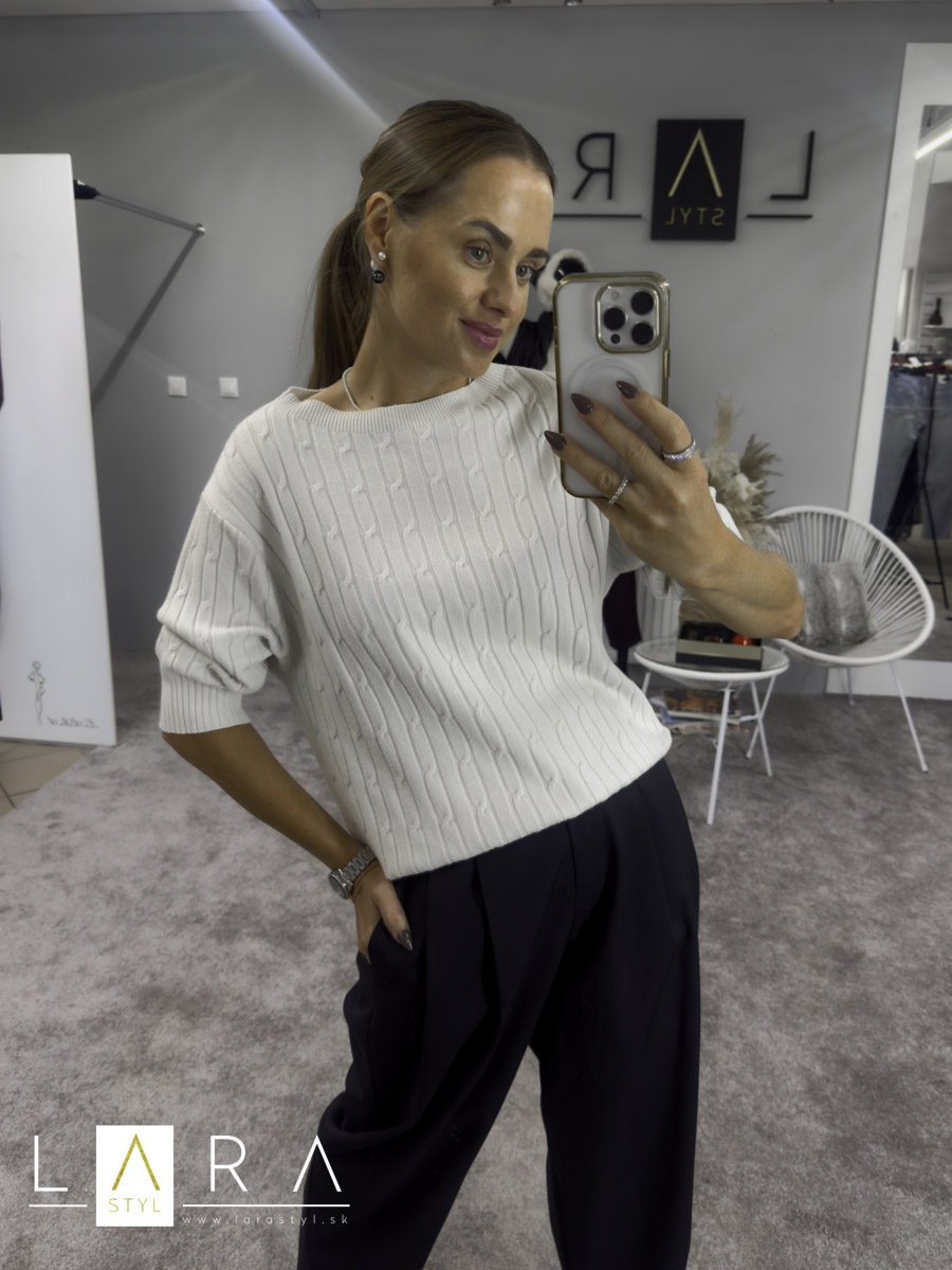 Dámsky pulóver s 3/4 rukávom a nádherným jemným vzorom. Elastický materiál. Modelka má výšku 165 cm.